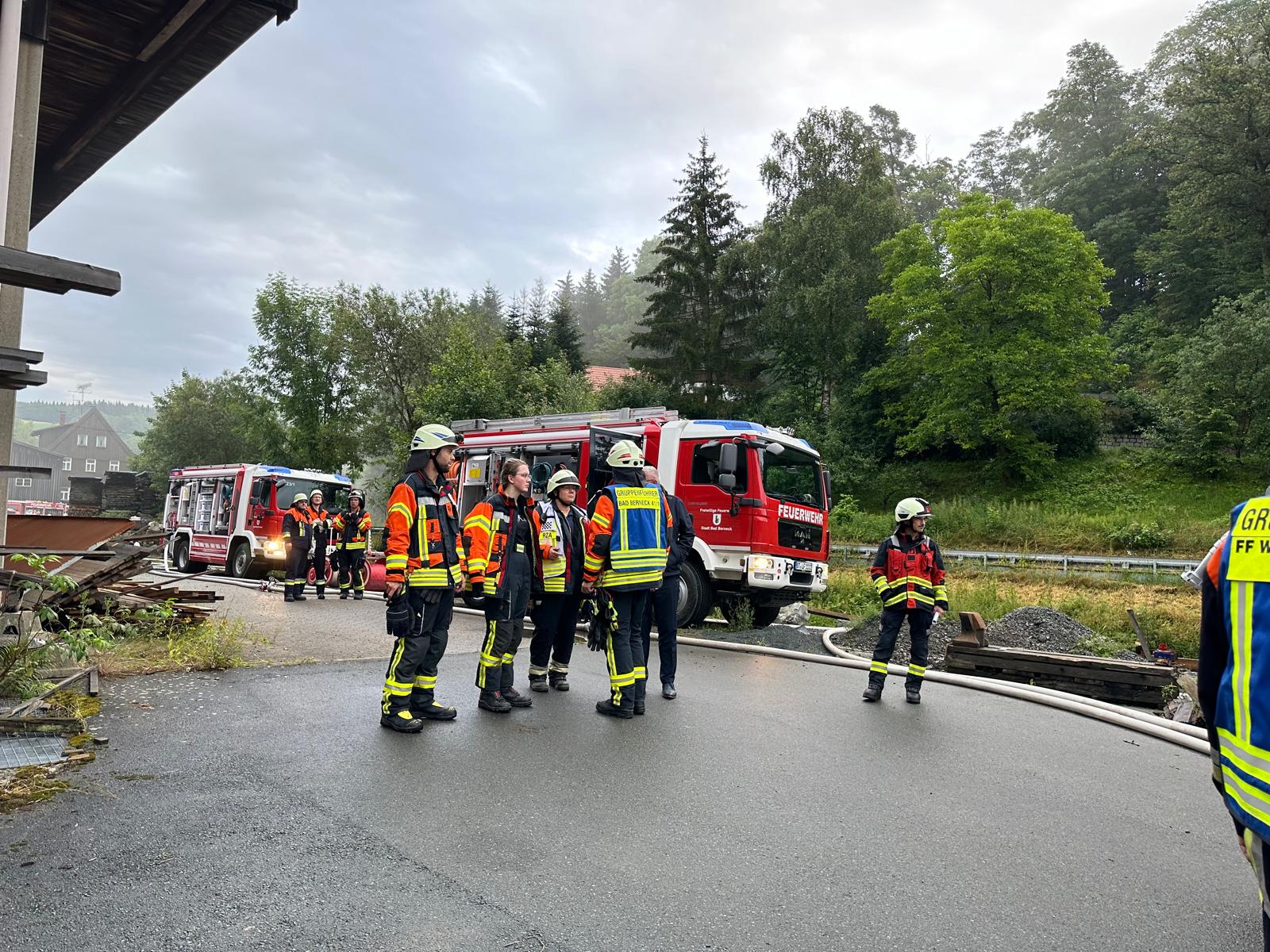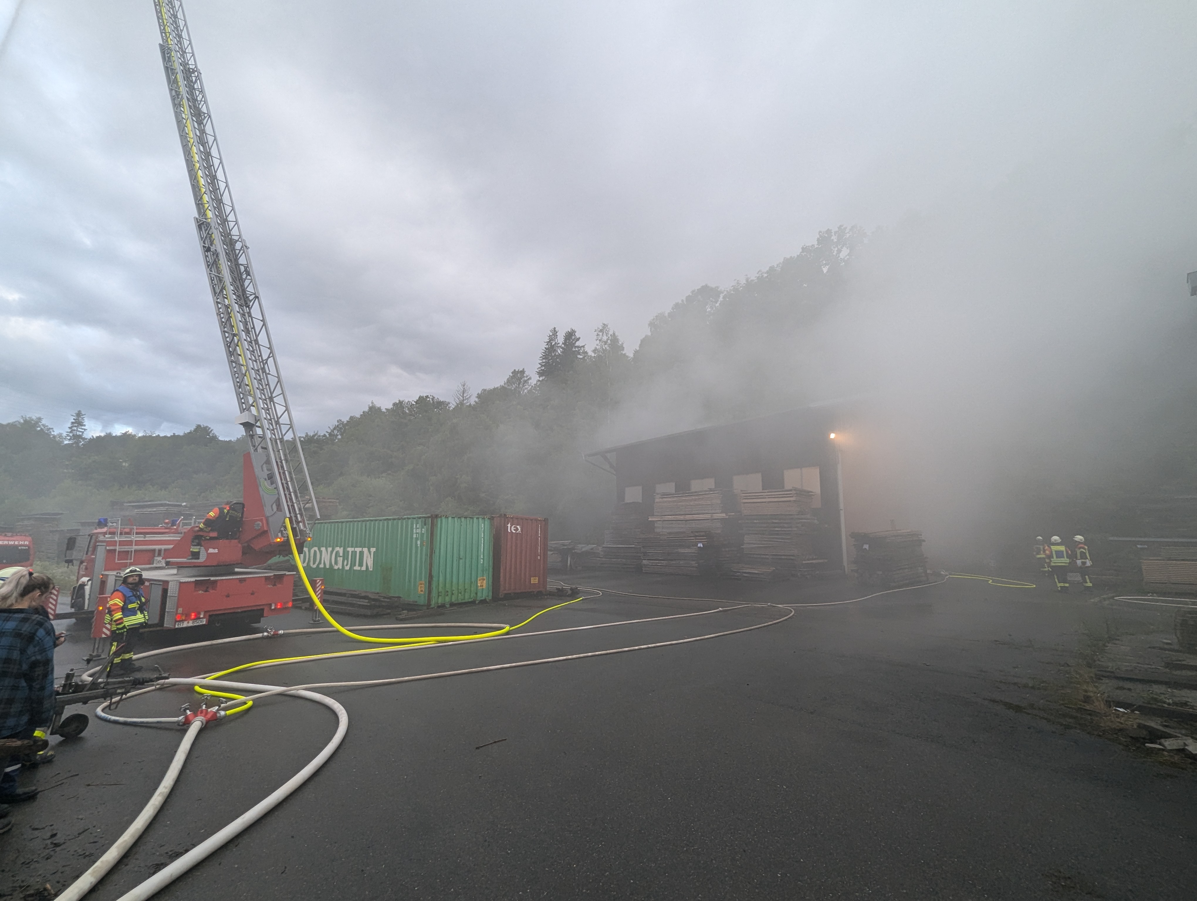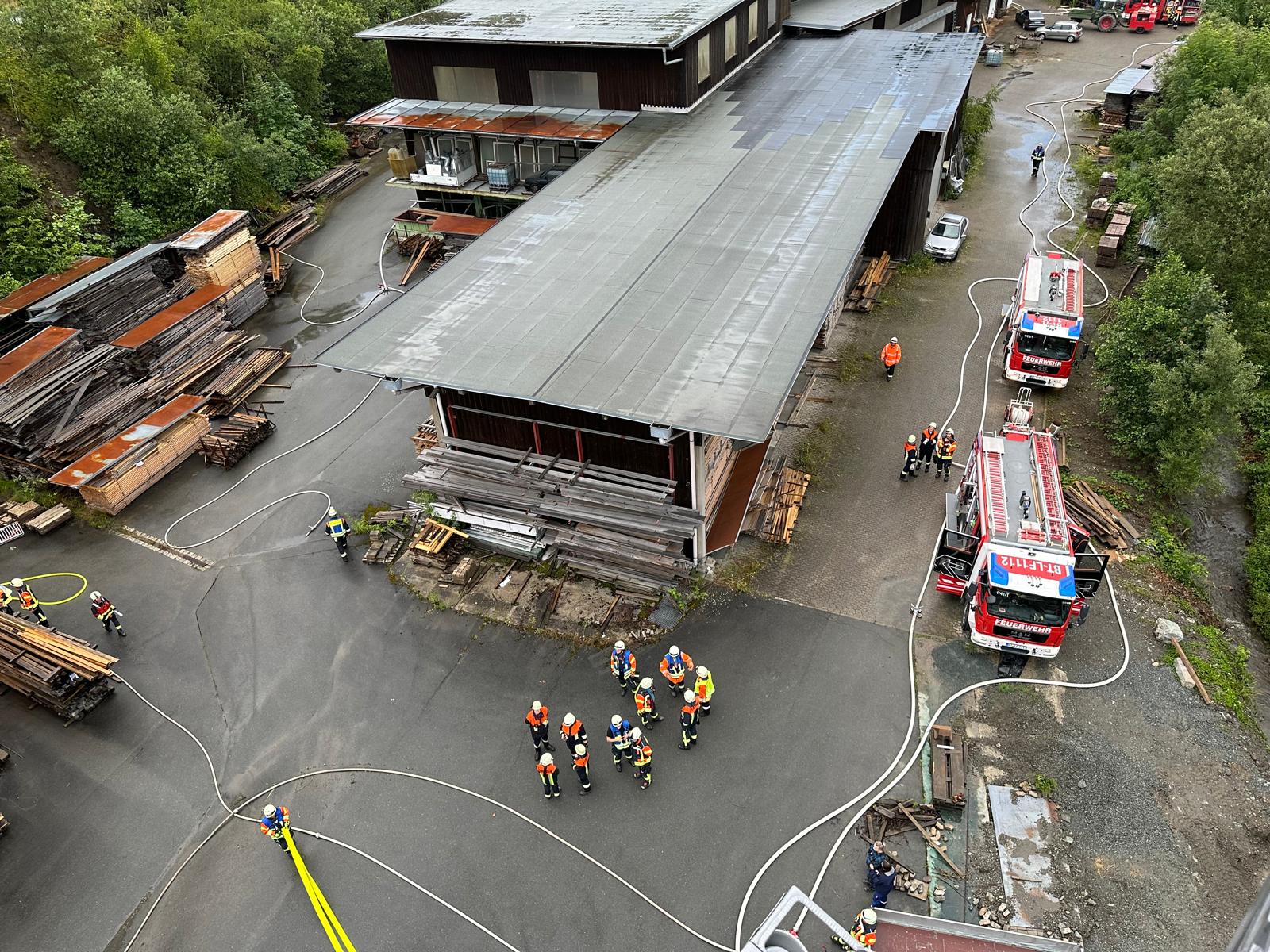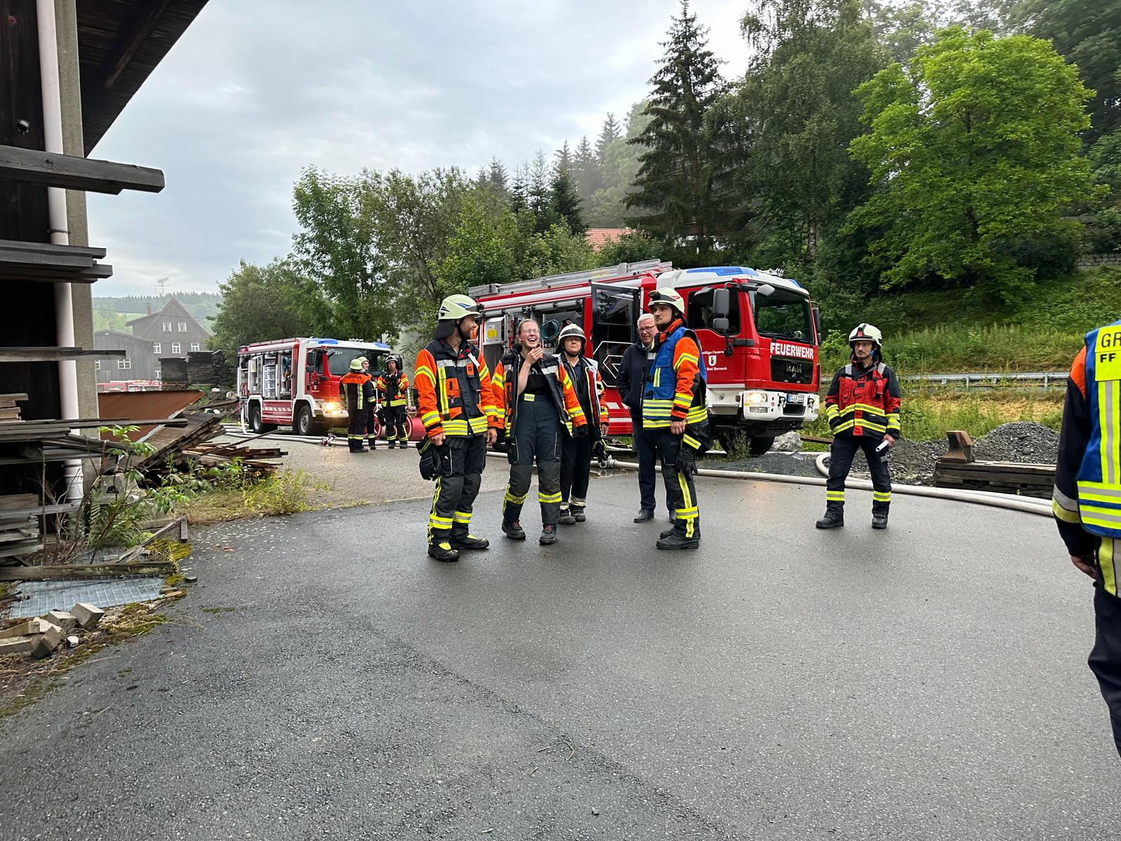 Währenddessen war man außerhalb des Gebäudes aber nicht untätig: Zwischenzeitlich wurden alle Ortswehren angefordert, aus dem Knodenbach wurde Löschwasser angesaugt. Auf dem Gelände wurden mehrere Löschangriffe zur Riegelstellung und Absicherung der umliegenden Gebäude und Holzstapel eingerichet. Im weiteren Verlauf wurde angenommen, dass er Brand auf den unmittelbar angrenzenden Wald übergreift. Deshalb wurden auch hier noch mehrere Rohre zur Brandbekämpfung eingesetzt.