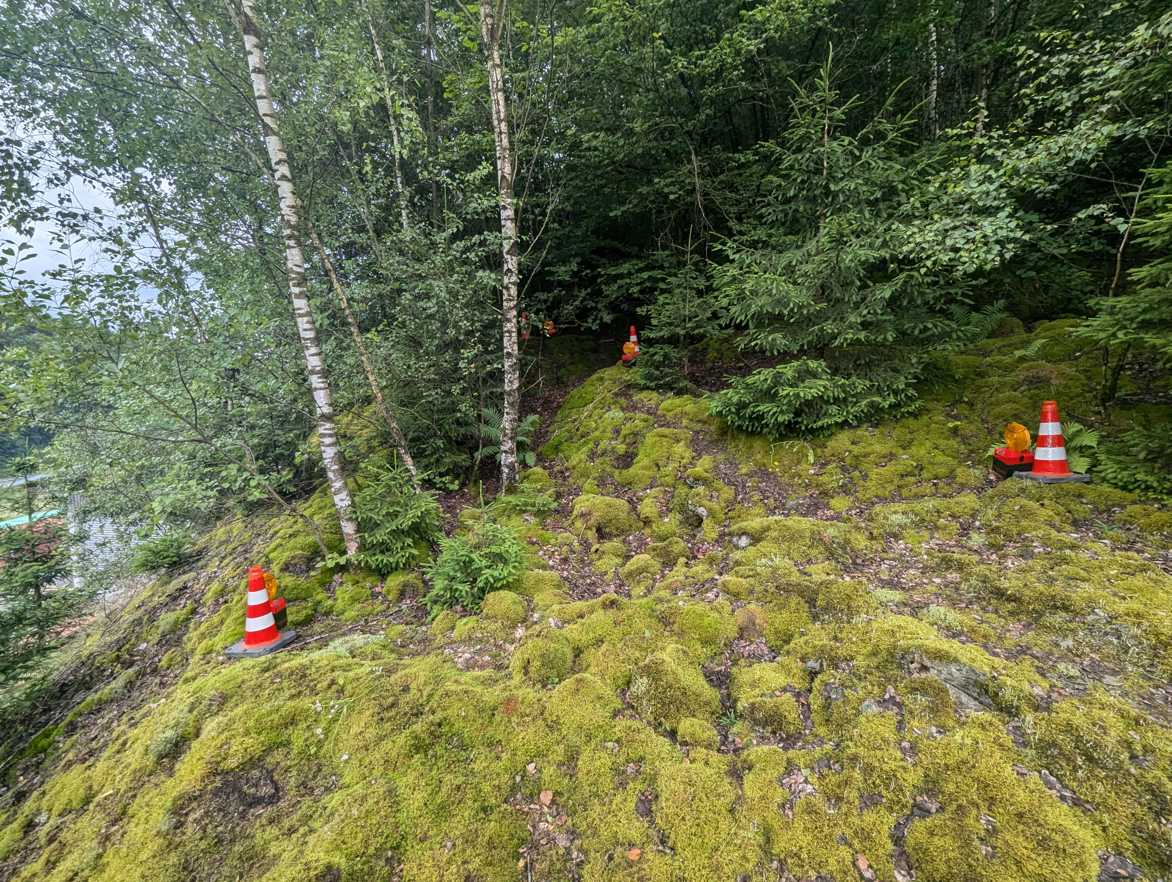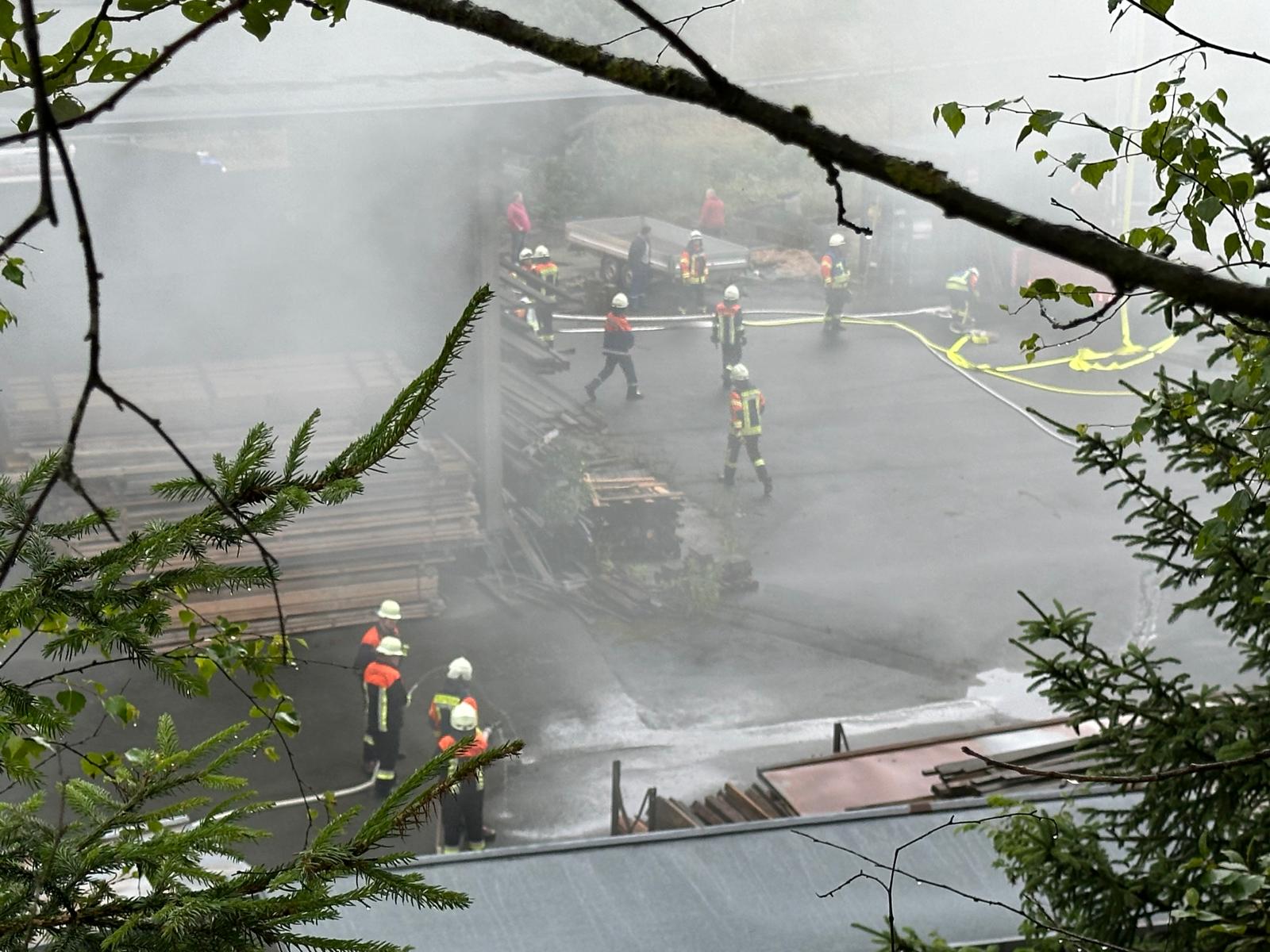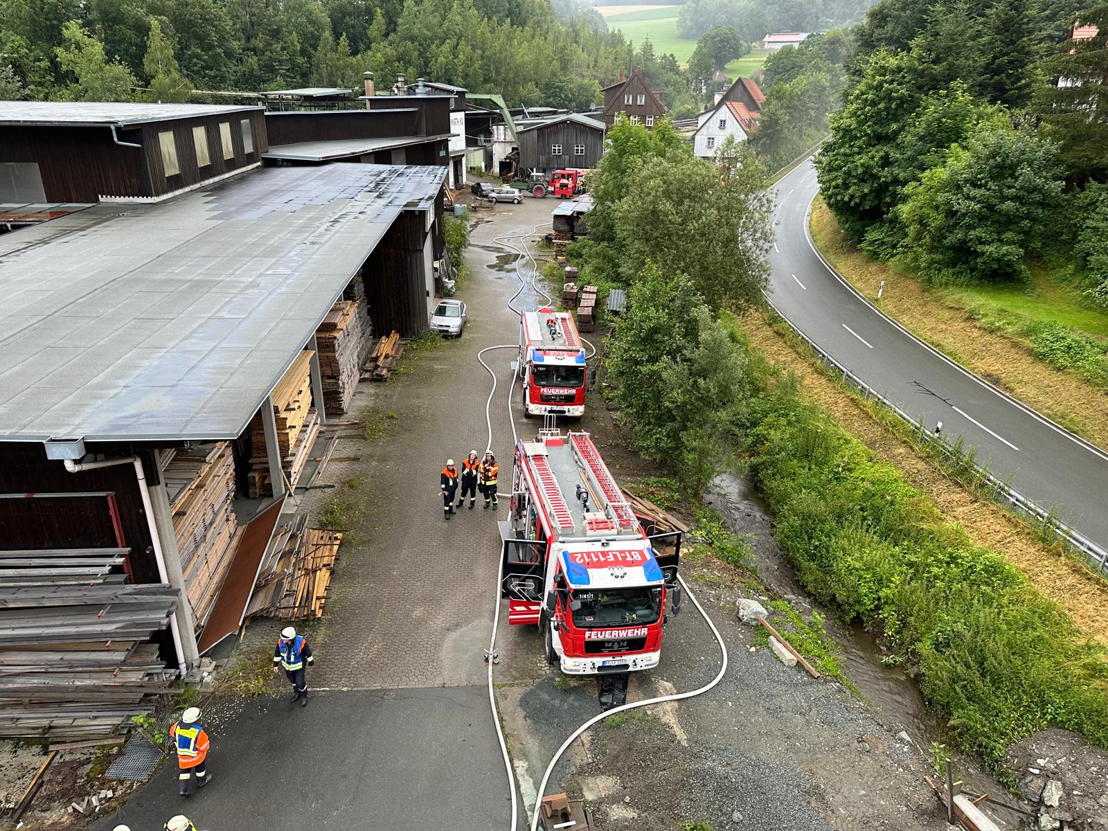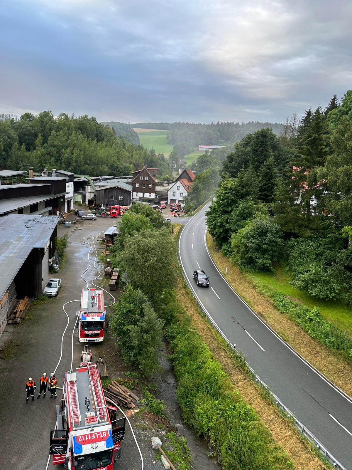 Währenddessen war man außerhalb des Gebäudes aber nicht untätig: Zwischenzeitlich wurden alle Ortswehren angefordert, aus dem Knodenbach wurde Löschwasser angesaugt. Auf dem Gelände wurden mehrere Löschangriffe zur Riegelstellung und Absicherung der umliegenden Gebäude und Holzstapel eingerichet. Im weiteren Verlauf wurde angenommen, dass er Brand auf den unmittelbar angrenzenden Wald übergreift. Deshalb wurden auch hier noch mehrere Rohre zur Brandbekämpfung eingesetzt.
