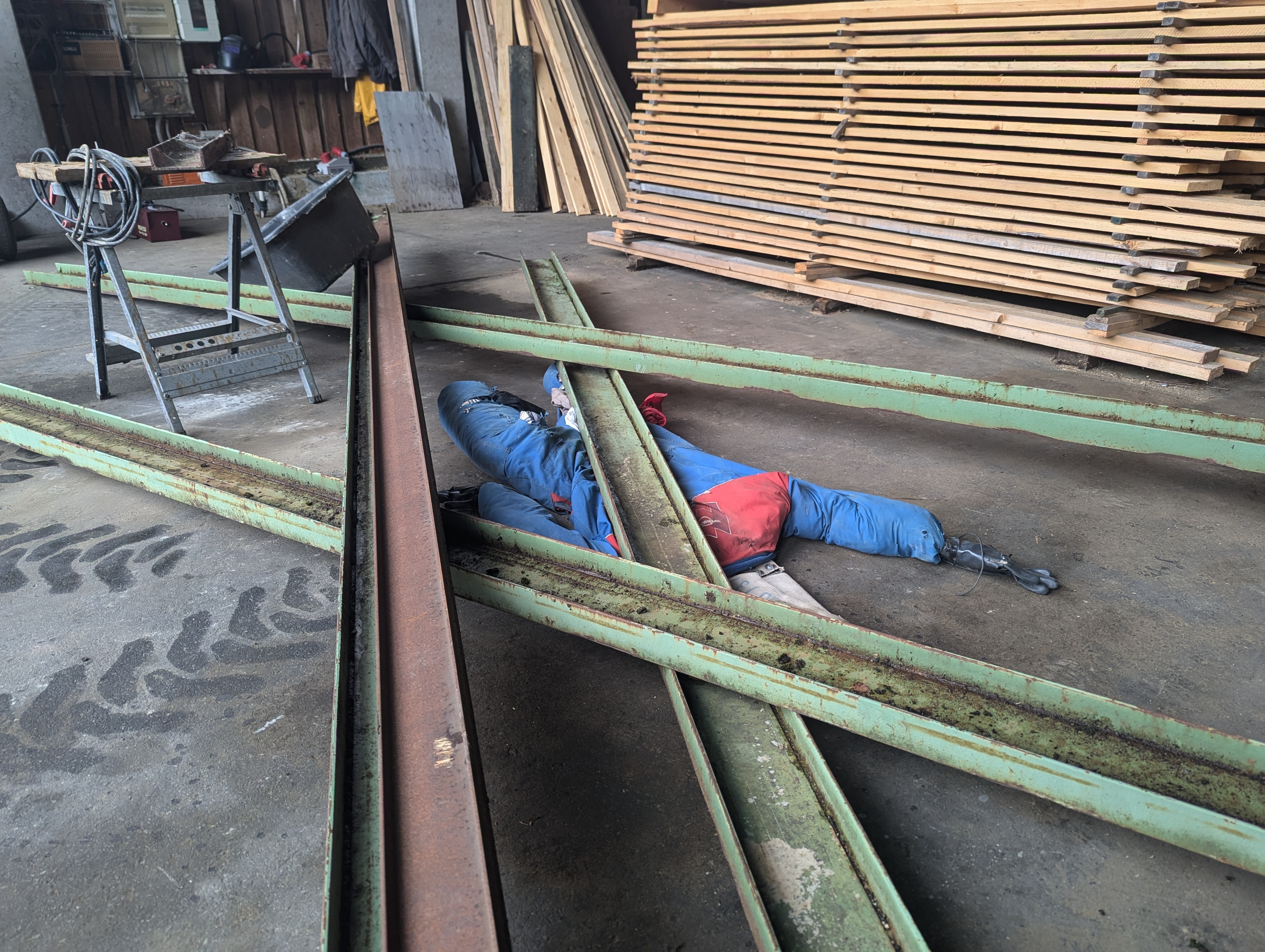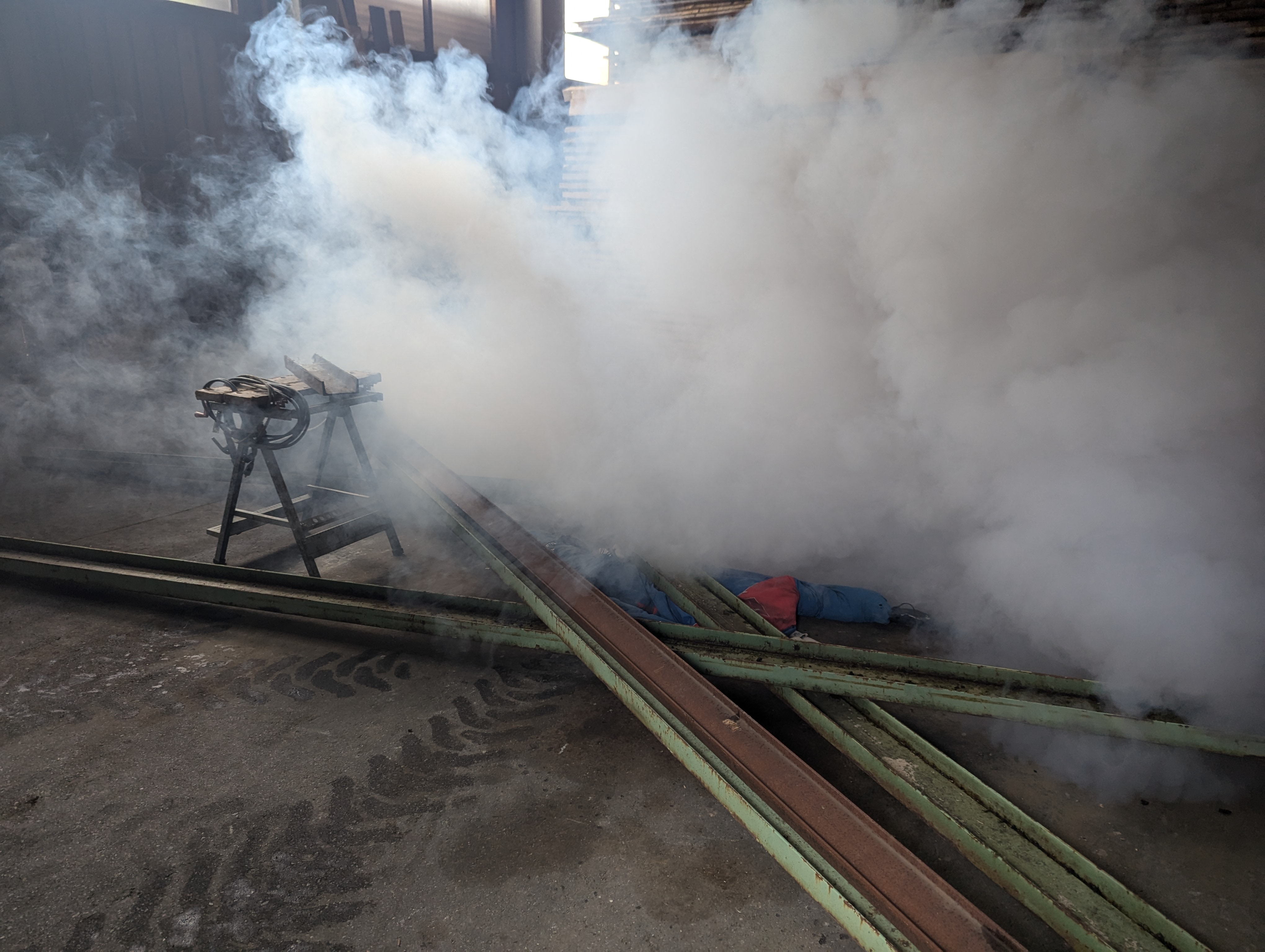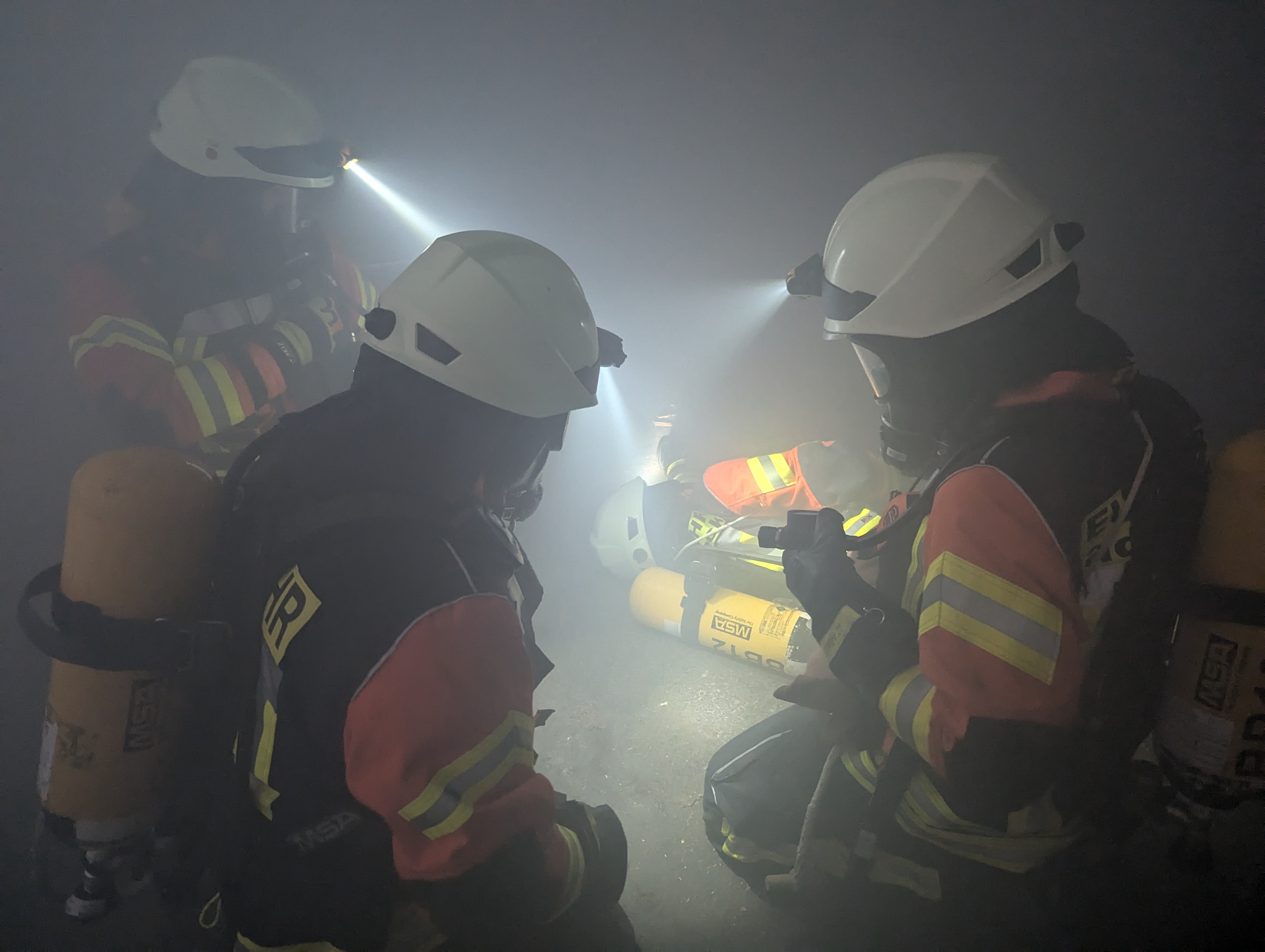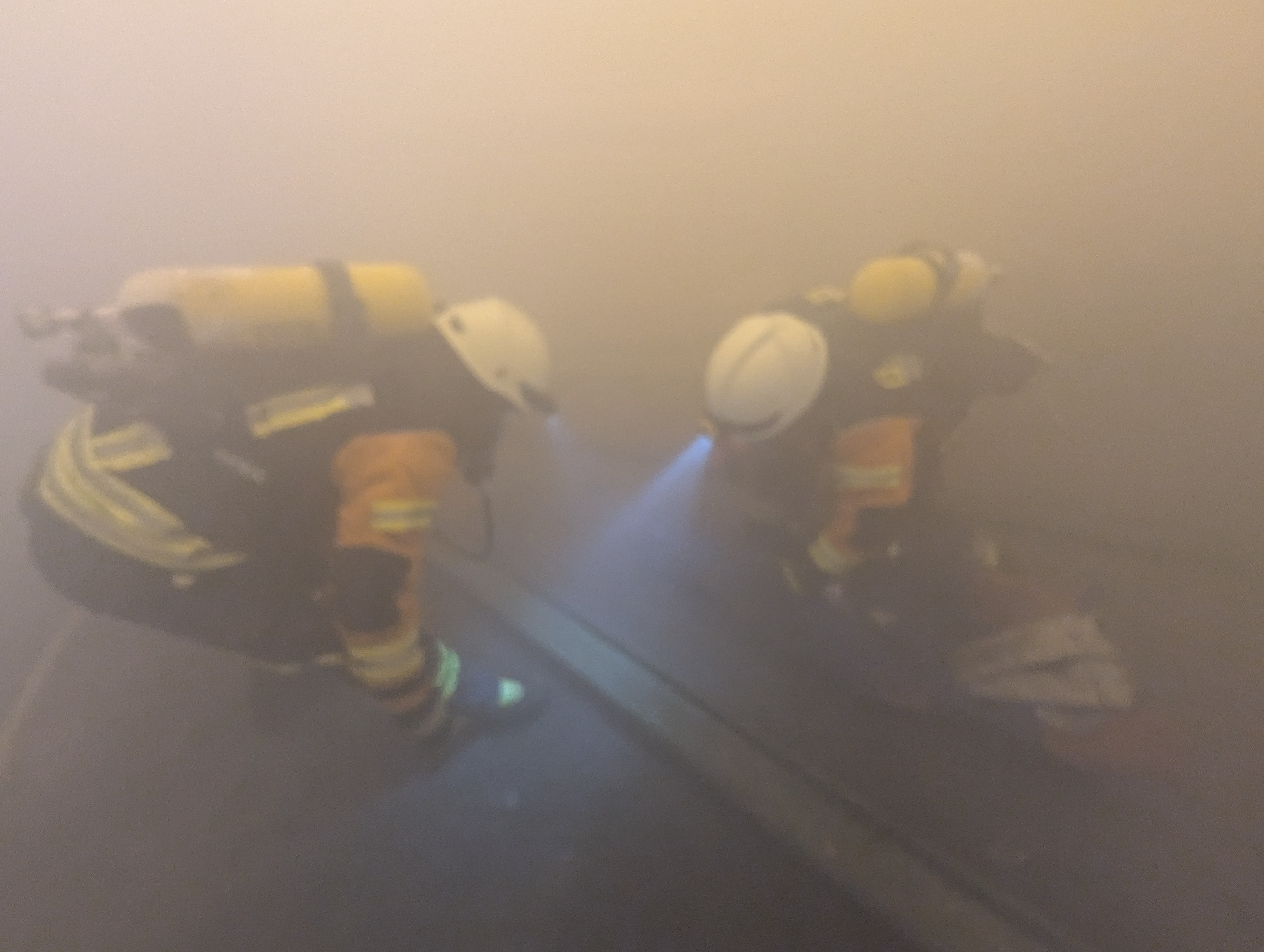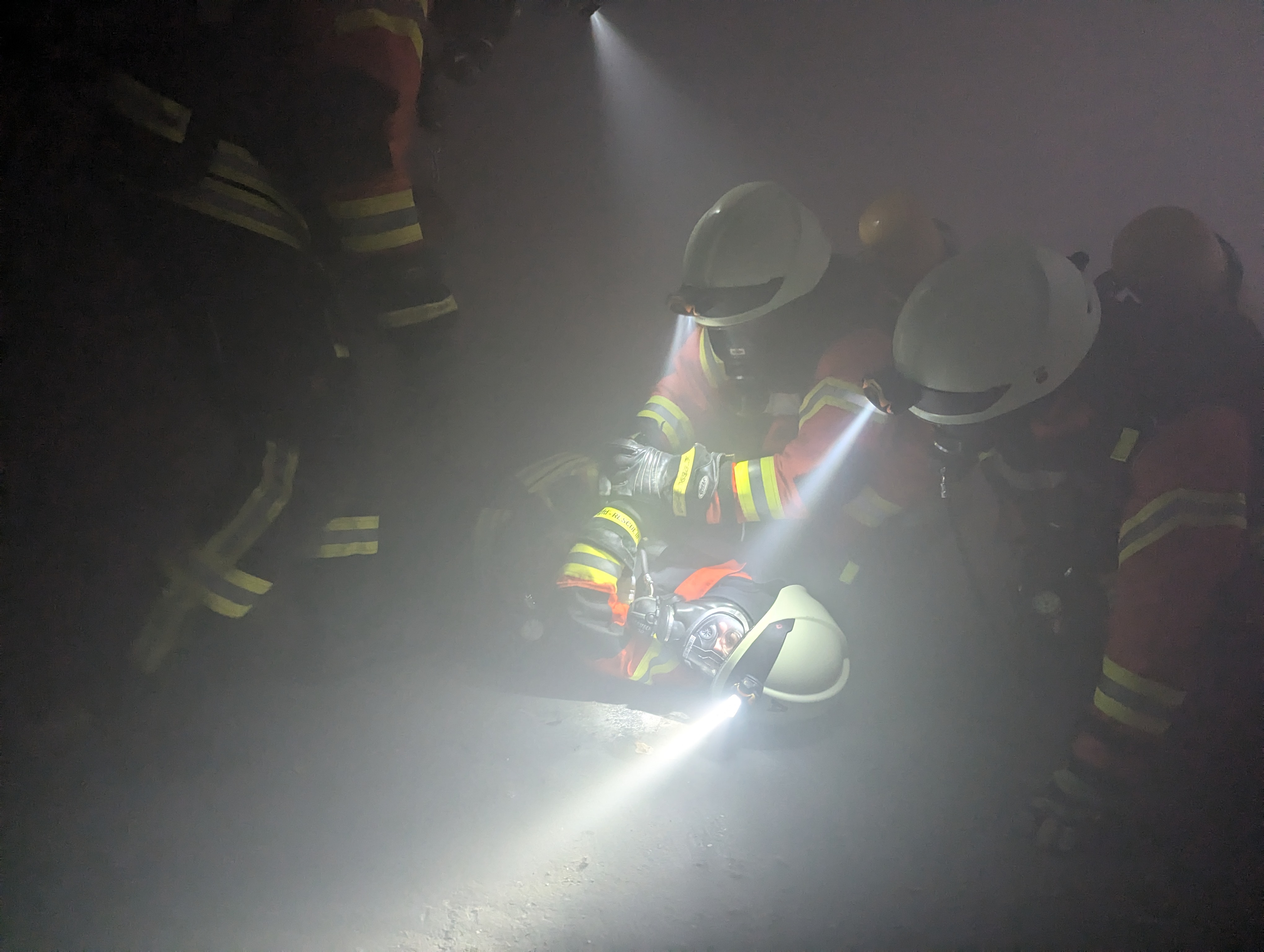Zügig wurde eine Wasserversorgung aufgebaut und ein erster Atemschutztrupp zur Brandbekämpfung und Menschenrettung in das Gebäude geschickt. Da sich die Hallentore durch den Brand nicht mehr öffnen ließen, blieb nur noch eine schmale Tür als einziger Zutrittsweg zum Gebäude. Der Brandherd - das Schweißgerät - wurde schnell ausfündig gemacht und der angenommene Brand gelöscht. Die Gasflaschen des Schweißgerätes wurden gekühlt und anschließend nach draußen gebracht. Beim weiteren Absuchen des Raumes traf der Angriffstrupp schnell auf die erste vermisste Person: Eine Übungspuppe lag unter fünf schweren Stahlträgern begraben und musste mit technischem Gerät befreit werden. Hierfür forderte der Trupp Unterstützung mit Werkzeug an und machte sich währenddessen auf die Suche nach der zweiten vermissten Person. Auf dem Weg dorthin wurde eine weitere Schwierigkeit eingebaut: Wir nahmen an, dass der Truppmann durch die Anstrengung kollabiert ist und nun bewusstlos am Boden liegt. Der Truppführer setzte über sein Funkgerät mittels Mayday-Schema einen Notruf nach draußen ab, ein zweiter Trupp war sofort zur Stelle und leistete Unterstützung bei der Rettung des verunfallten Geräteträgers. Nachdem die Geräteträger diesen Atemschutznotfall gut gelöst haben, konnte auch die Personenrettung der zwei Vermissten rasch erledigt werden.