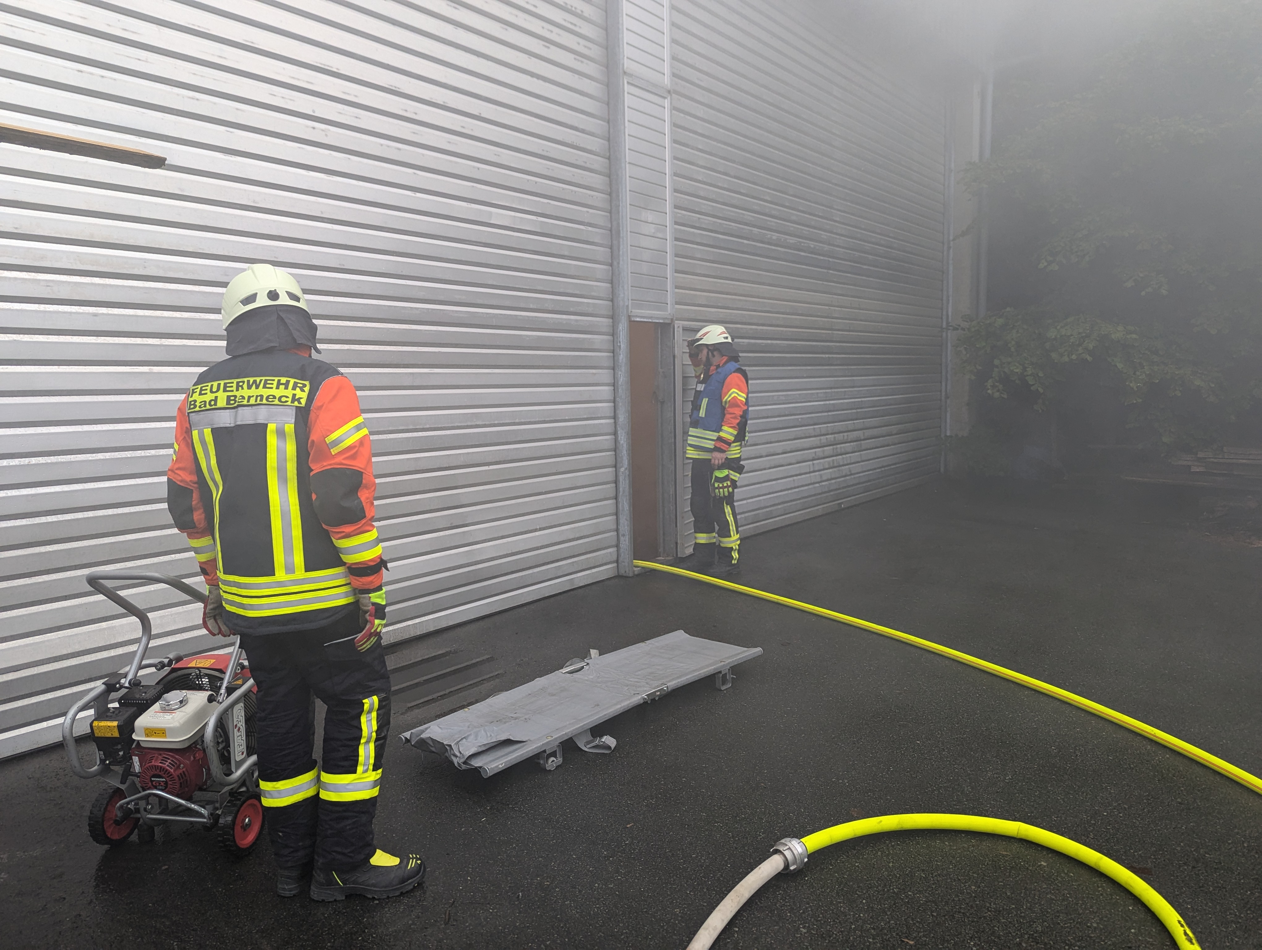 Pünktlich um 19:00 Uhr erhielten die Kommandanten das "Alarmschreiben" für die Übung: Brand eines Mülleimers im Freien, auf dem Gelände des Sägewerkes Wirth. Beim Eintreffen am Übungsobjekt war allerdings bereits eine starke Rauchentwicklung aus einer Halle erkennbar. Die Erkundung und Befragung der Anlieger ergab, dass es bei Schweißarbeiten in der Halle zu einer Explosion mit anschließendem Feuer kam, es werden noch zwei Personen vermisst.