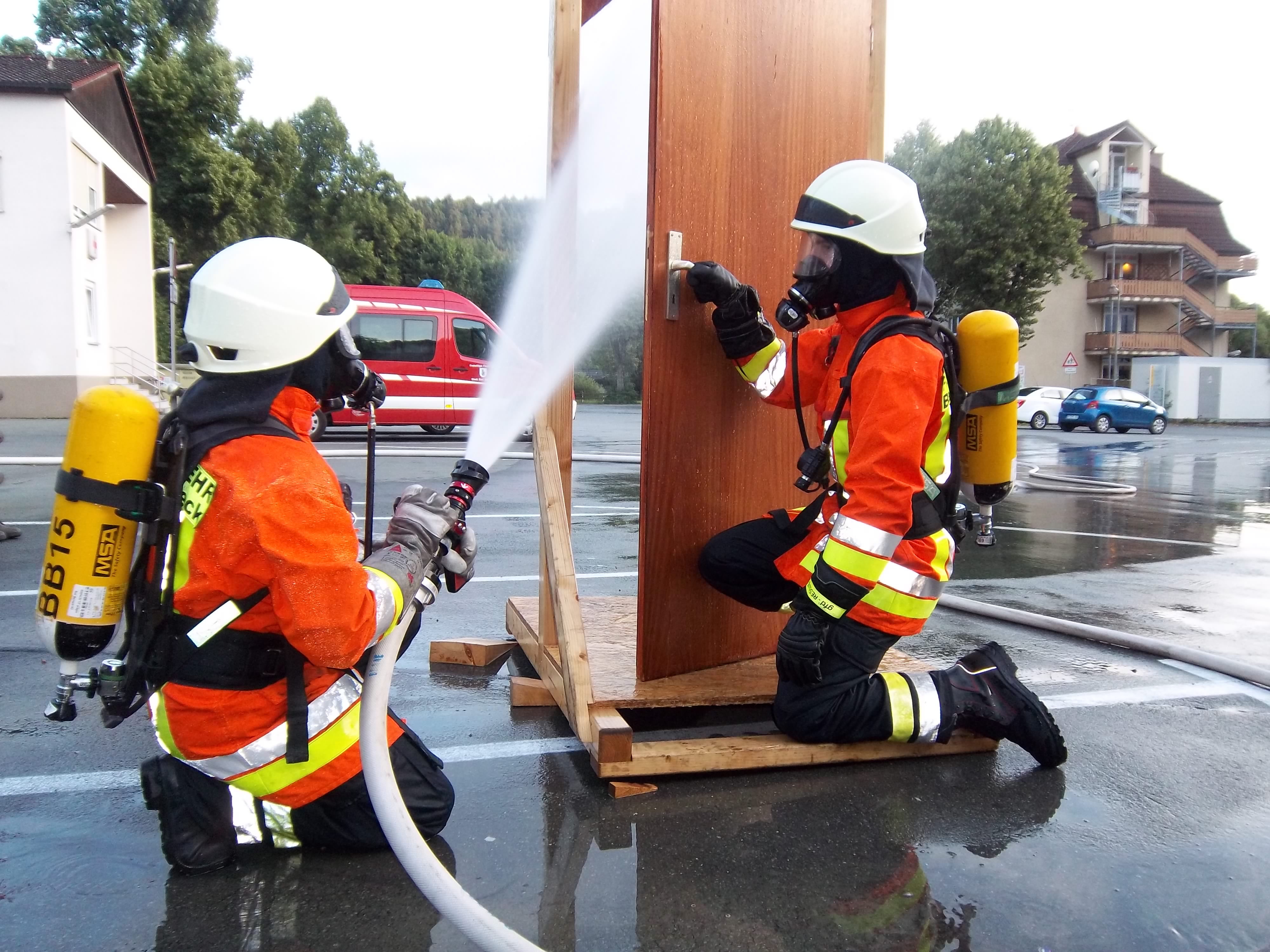 Am Anfang stand das korrekte Anlegen von Maske, Flammschutzhaube und Atemschutzgerät. Im weiteren Verlauf trainierten die Teilnehmer unter anderem Such- und Rettungstechniken, das Öffnen von Türen im Innenangriff sowie den Umgang mit dem Hohlstrahlrohr. Zudem absolvierten die Teilnehmer eine Belastungsübung in der Atemschutzstrecke in Bayreuth sowie eine Heißausbildung am Oschenberg.