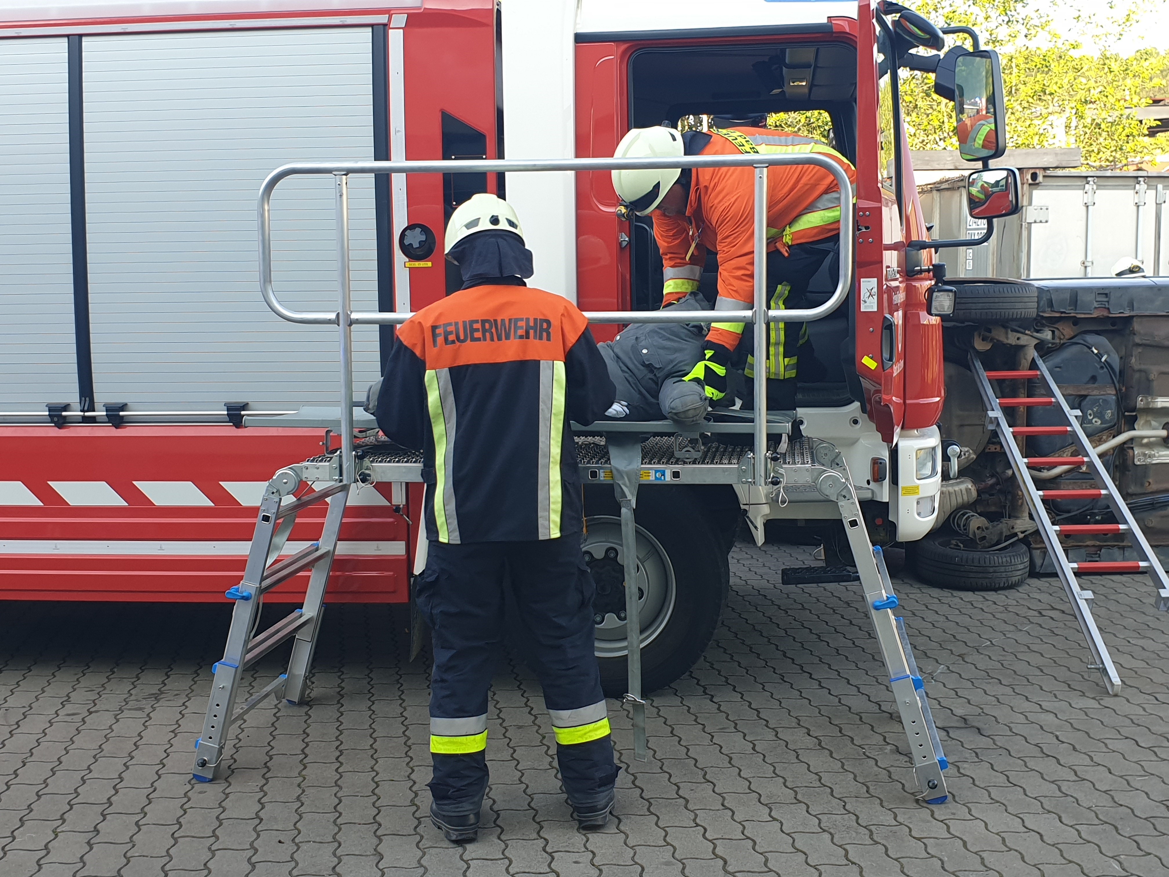 Gleichzeitig konnte der Fahrer des LKWs mittels der Rettungsplattform, die auf der Beifahrerseite aufgebaut wurde, gerettet werden.