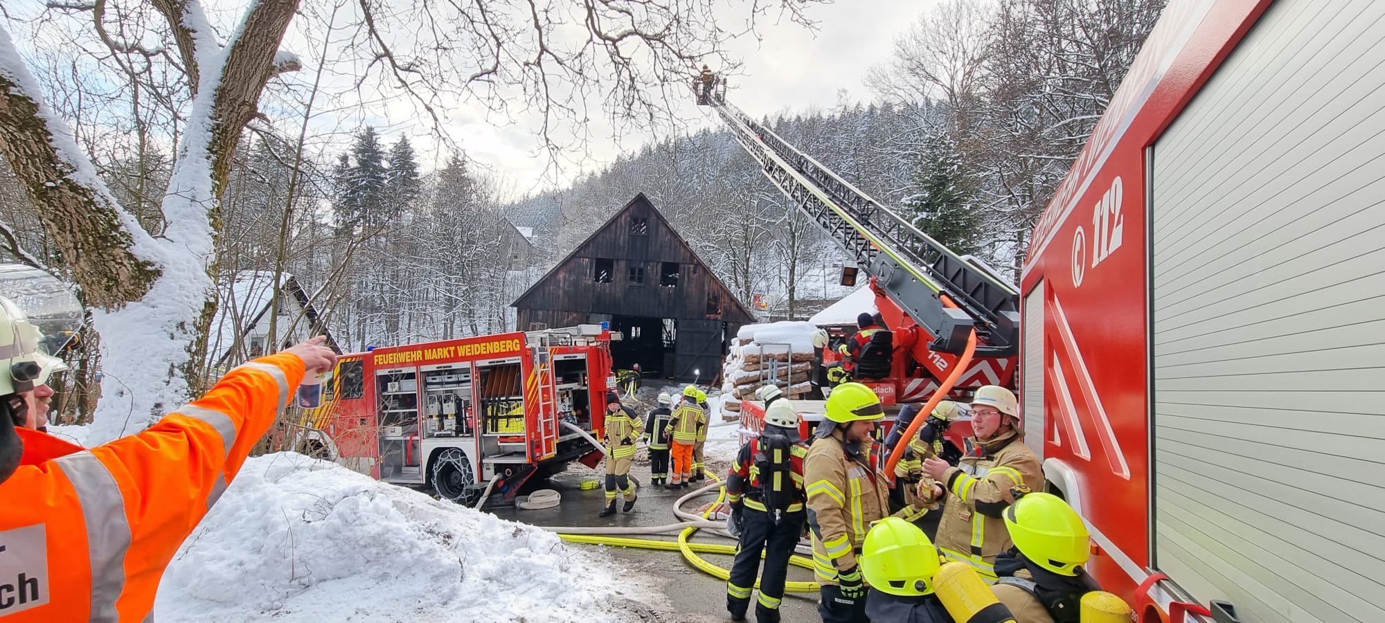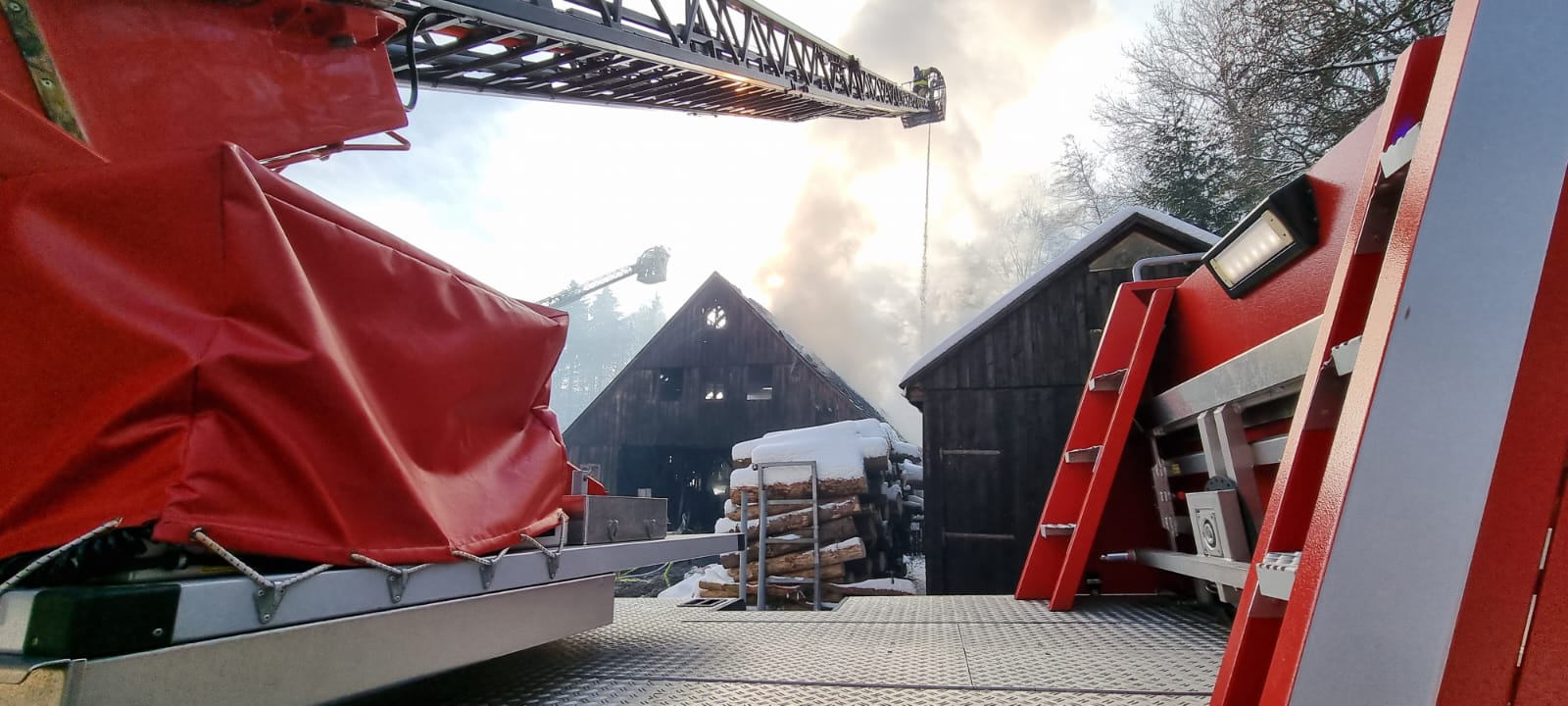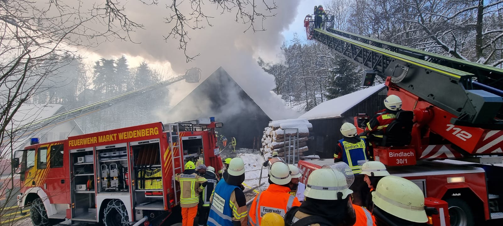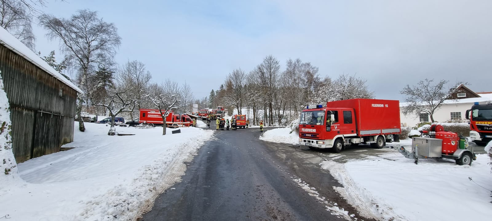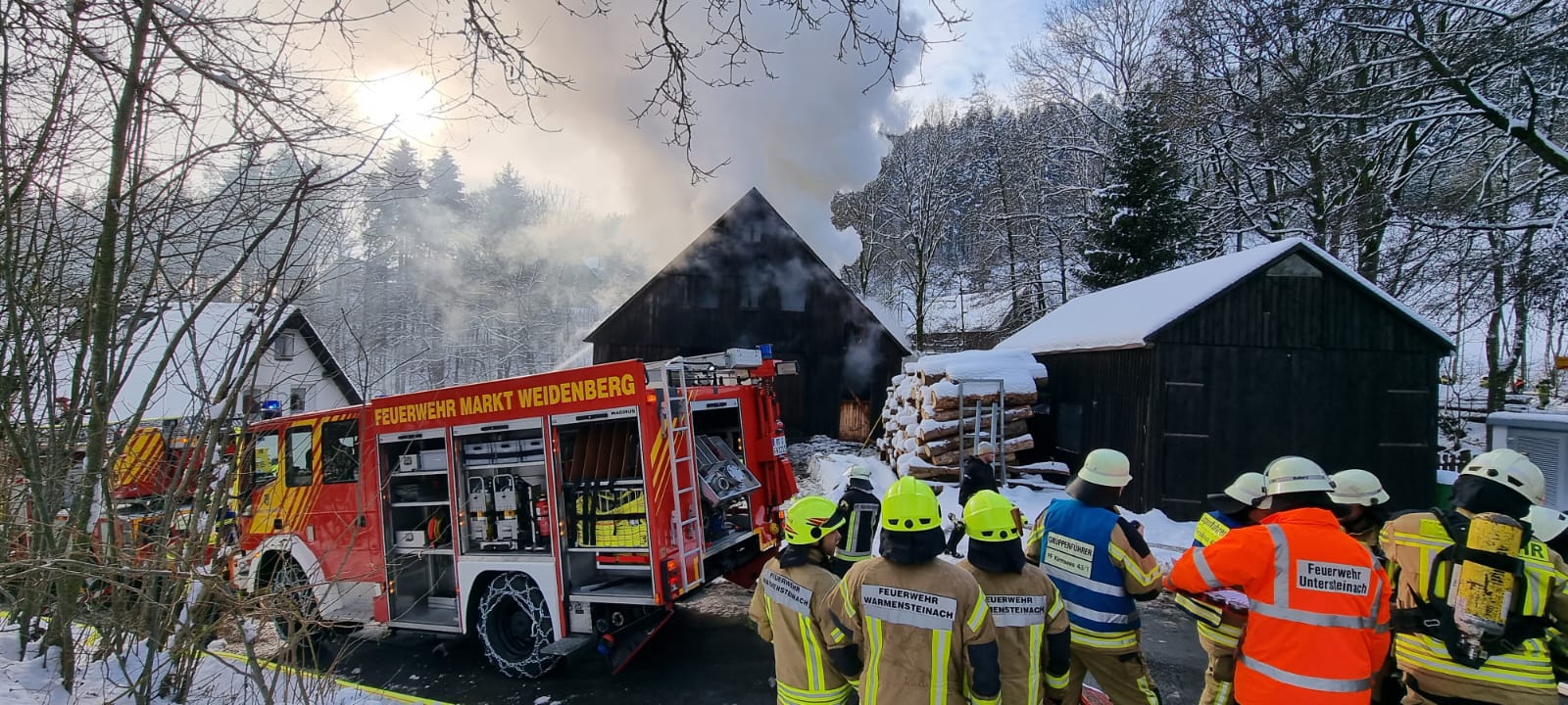 Am Mittwoch, den 12. Januar 2022, wurden wir um 11:16 zu einem Scheunenbrand in einer kleinen Ortschaft bei Weidenberg alarmiert. Bereits während der Anfahrt konnten wir eine dicke Rauchwolke erkennen.