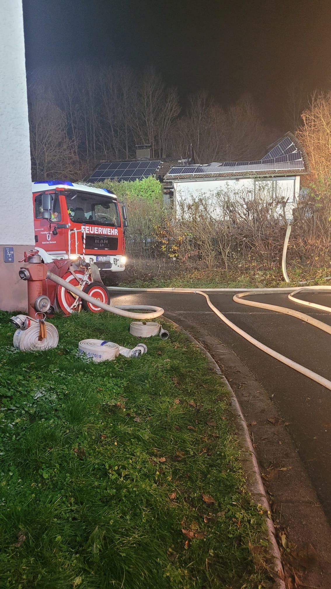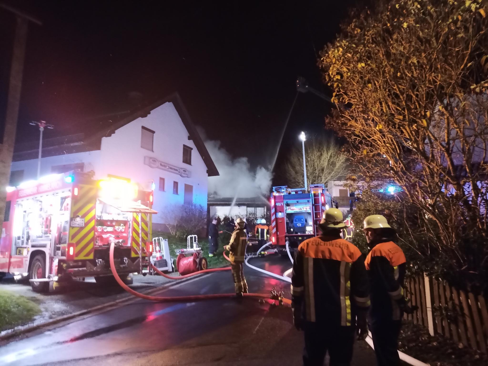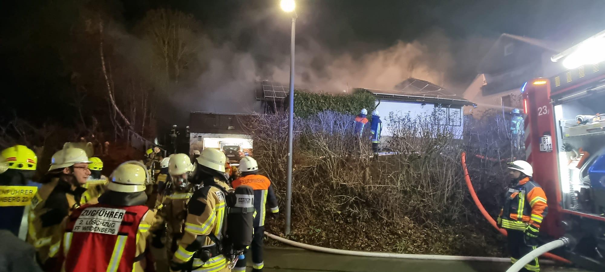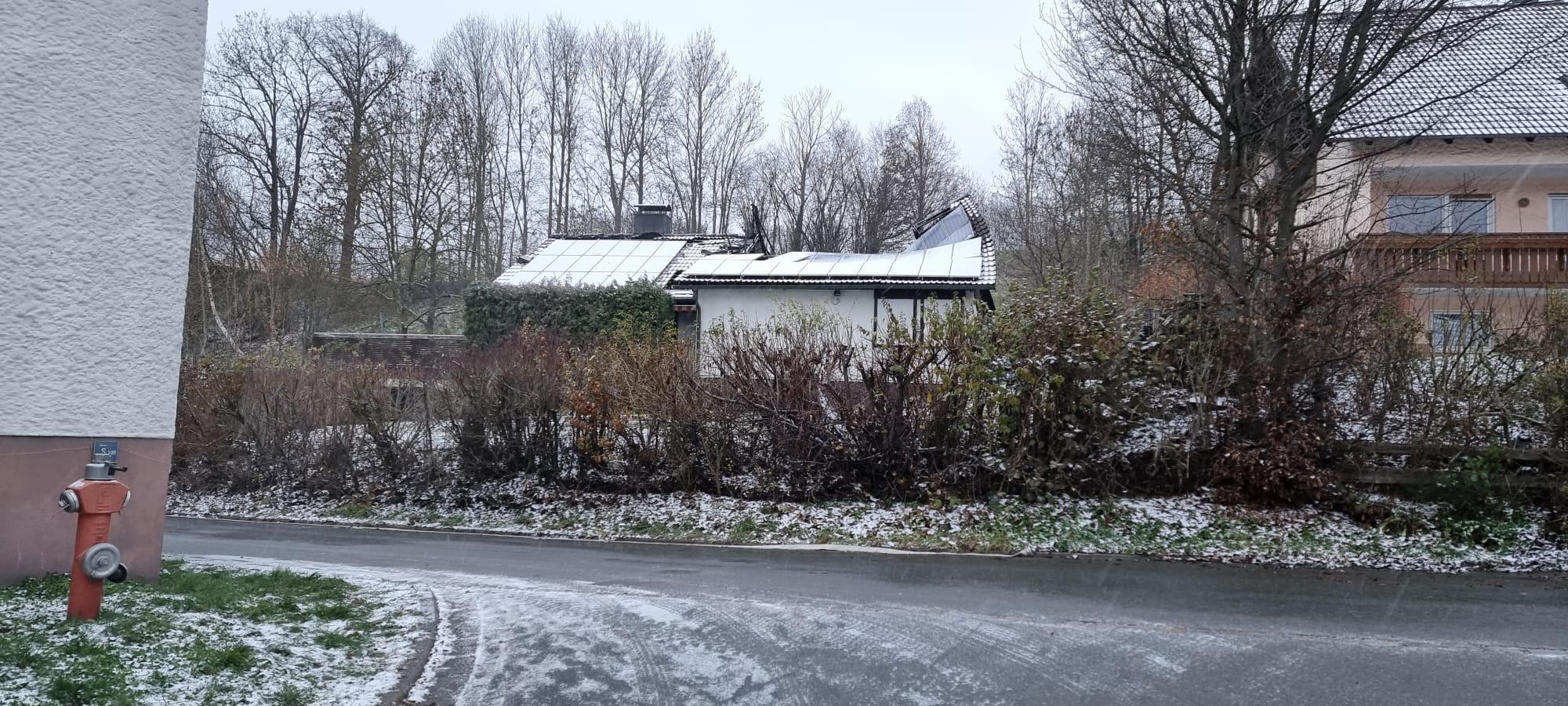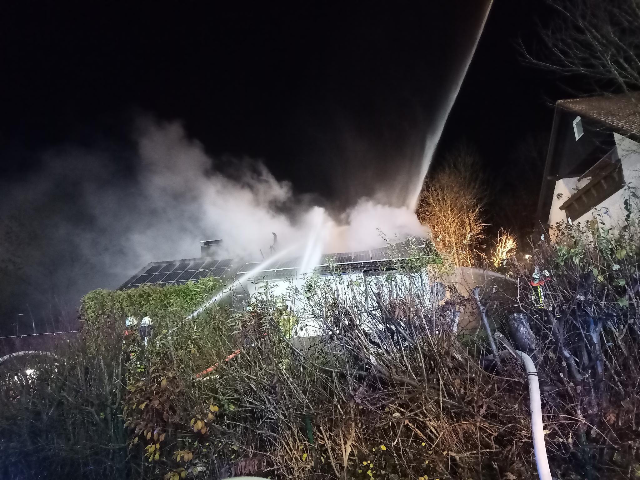 Bei Eintreffen der ersten Kräfte hatte sich das Feuer von einem Holzunterstand bereits auf den gesamten Dachstuhl ausgebreitet. Die Brandbekämpfung stellte sich als sehr schwierig heraus, da die auf dem Dach installierte Photovoltaikanlage den Zugang zum Feuer stark erschwerte. Unser TLF stellte in den ersten Minuten die Wasserversorgung sicher, während die Mannschaft unseres LF den Erstangriff unter Atemschutz unternahm. Zeitgleich baute die Feuerwehr Gefrees mit ihrer Drehleiter eine Riegelstellung zum Schutz des Nachbarhauses auf. Im weiteren Verlauf des Einsatzes bekämpften viele weitere Atemschutztrupps der anwesenden Wehren das Feuer im Außenangriff von allen Seiten. Zusätzlich wurde auch noch die Drehleiter der Feuerwehr Weidenberg eingesetzt. Ein Innenangriff war nicht möglich, da das Dach unter der Last der PV-Anlage bereits im frühen Einsatzverlauf eingebrochen war.