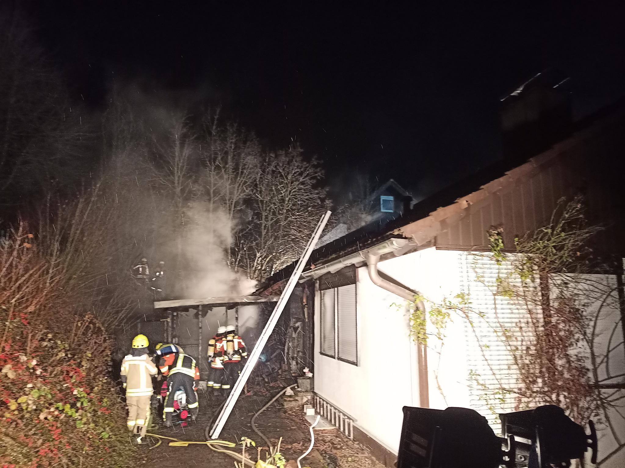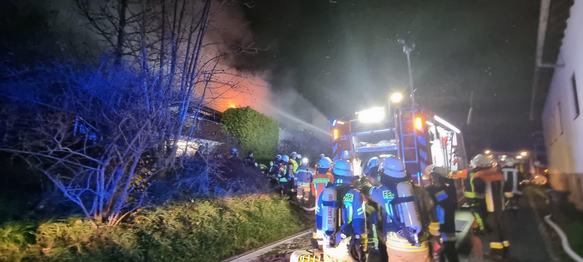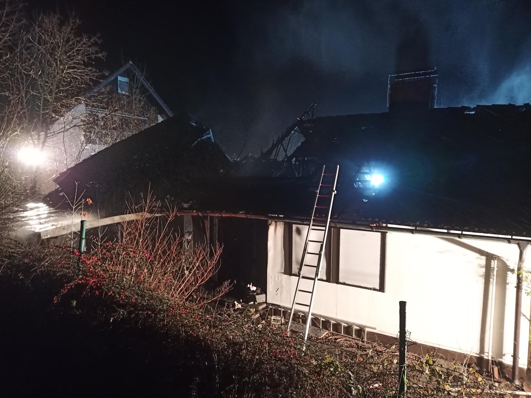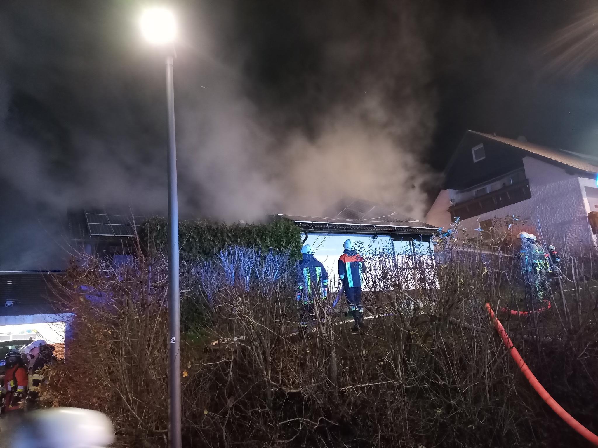 Bei Eintreffen der ersten Kräfte hatte sich das Feuer von einem Holzunterstand bereits auf den gesamten Dachstuhl ausgebreitet. Die Brandbekämpfung stellte sich als sehr schwierig heraus, da die auf dem Dach installierte Photovoltaikanlage den Zugang zum Feuer stark erschwerte. Unser TLF stellte in den ersten Minuten die Wasserversorgung sicher, während die Mannschaft unseres LF den Erstangriff unter Atemschutz unternahm. Zeitgleich baute die Feuerwehr Gefrees mit ihrer Drehleiter eine Riegelstellung zum Schutz des Nachbarhauses auf. Im weiteren Verlauf des Einsatzes bekämpften viele weitere Atemschutztrupps der anwesenden Wehren das Feuer im Außenangriff von allen Seiten. Zusätzlich wurde auch noch die Drehleiter der Feuerwehr Weidenberg eingesetzt. Ein Innenangriff war nicht möglich, da das Dach unter der Last der PV-Anlage bereits im frühen Einsatzverlauf eingebrochen war.