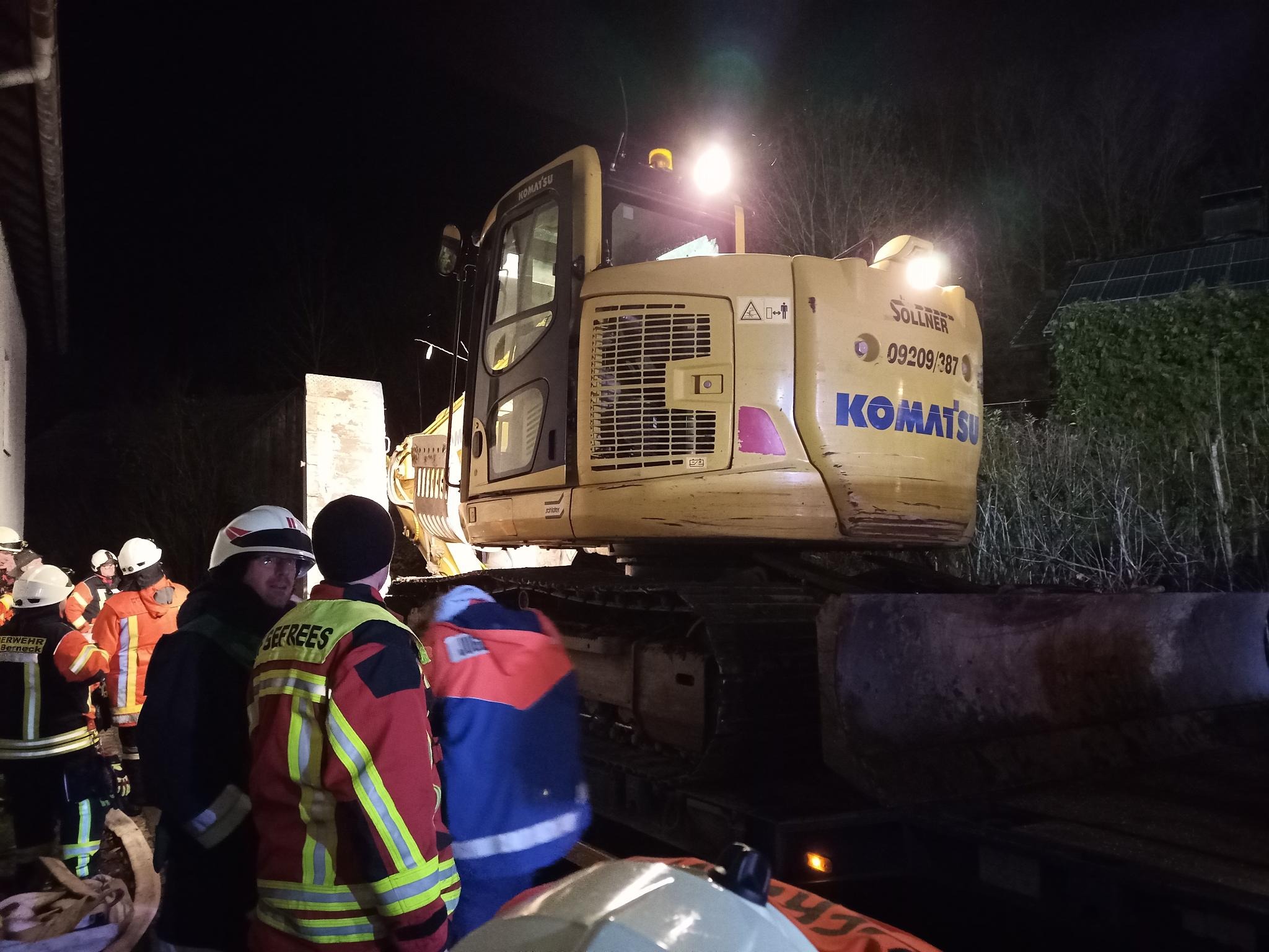 Nachdem die Flammen gelöscht waren, rief die Einsatzleitung einen Bagger zur Einsatzstelle. Der sollte das eingestürzte Dach auseinanderziehen, um den Zugang zu Glutnestern freizulegen. Bis dieser allerdings an der Einsatzstelle angekommen und einsatzbereit war, waren bereits alle erkennbaren Glutnester erloschen. Um den Schaden am Haus nicht noch unnötig zu erhöhen, wurde deshalb auf den Einsatz des Baggers verzichtet. Stattdessen stellte die Feuerwehr Bärnreuth gemeinsam mit uns bis Freitagmittag eine Brandwache sicher. Bei den regelmäßigen Kontrollen mit einer Wärmebildkamera wurden im Laufe der Wache aber keine Glutnester mehr gefunden.