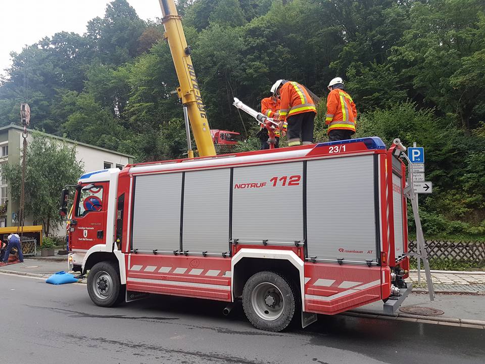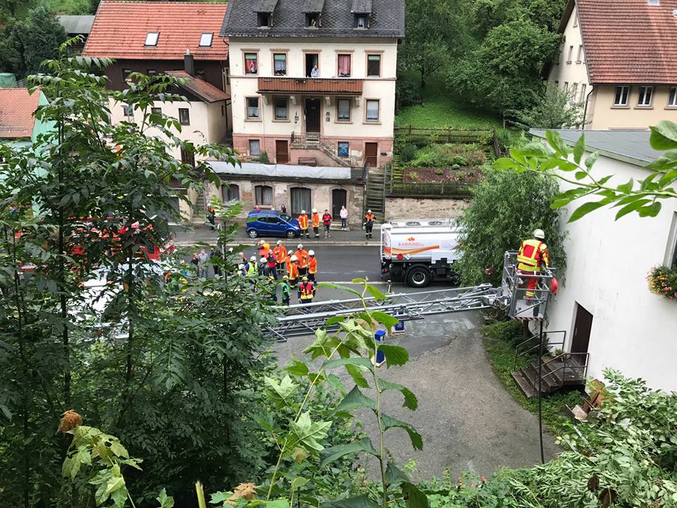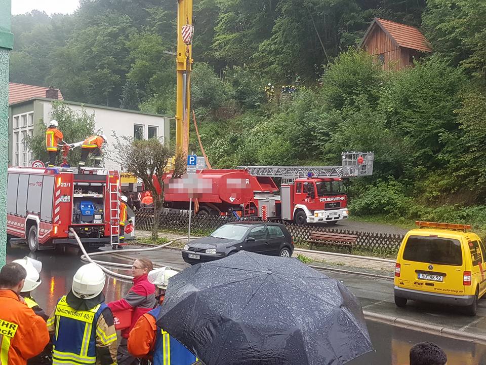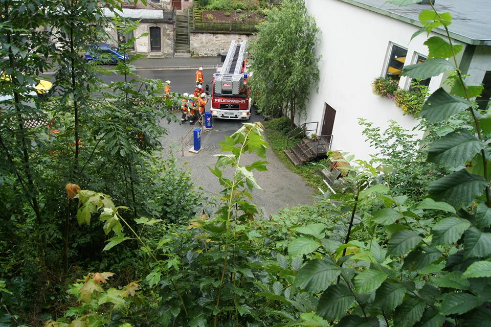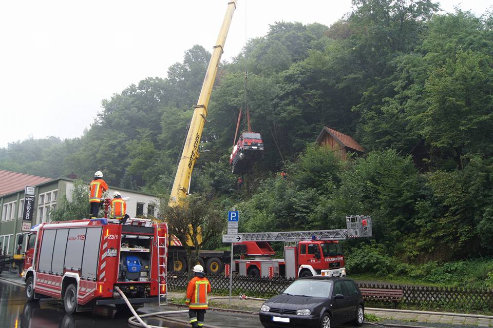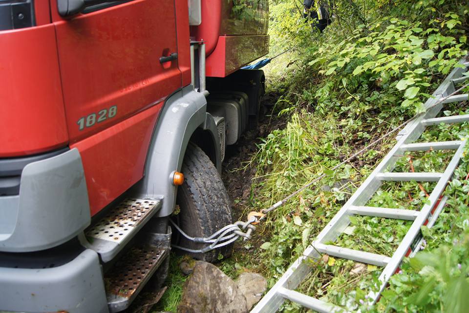 Der mit etwa 5500l Heizöl beladene Tanklaster fuhr am Freitagvormittag wegen einer falschen Naviansage auf einen gesperrten und viel zu engen Wanderweg. Als er schließlich stecken blieb, drohte er den mehrere Meter tiefen Abhang hinunterzustürzen. Ein Passant entdeckte den verunglückten LKW und informierte sofort unseren Kameraden Rainer Maisel, welcher sich daraufhin selbst ein Bild von der Lage machte. Wegen der akuten Absturzgefahr ließ er sofort alle Arbeiten am LKW einstellen und alarmierte ein Großaufgebot der Feuerwehr.
