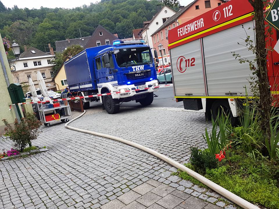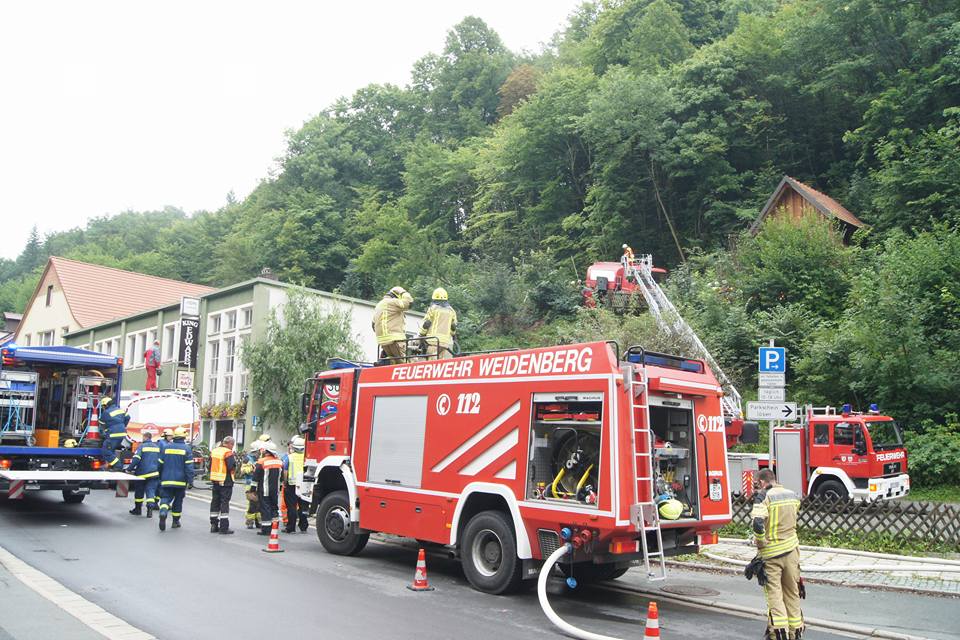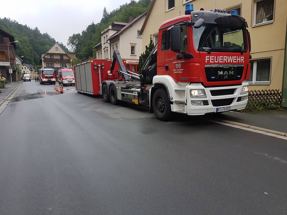 Wir übernahmen nach Eintreffen am Einsatzort zusammen mit der FF Lanzendorf die erste Absicherung des Lasters. Die Kameraden der FF Goldkronach und der FF Gefrees stellten den Brandschutz am Boden und mit der Drehleiter. Nach Eintreffen eines Ersatzfahrzeuges konnten die mehreren Tausend Liter Heizöl aus dem verunfallten LKW abgepumpt werden. Zuvor wurden umliegende Kanaldeckel mit Dichtkissen abgedichtet und der Bereich weiträumig abgesperrt. Während der Umfüllarbeiten stellte die FF Weidenberg weiteren Brandschutz mit einem Wasserwerfer.