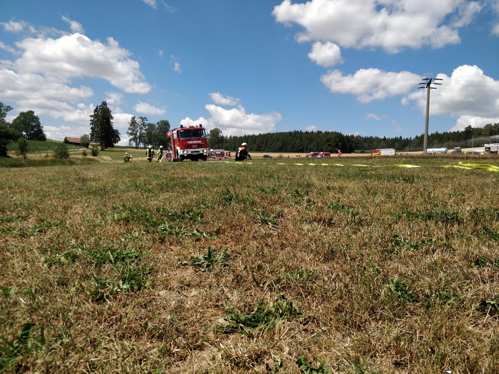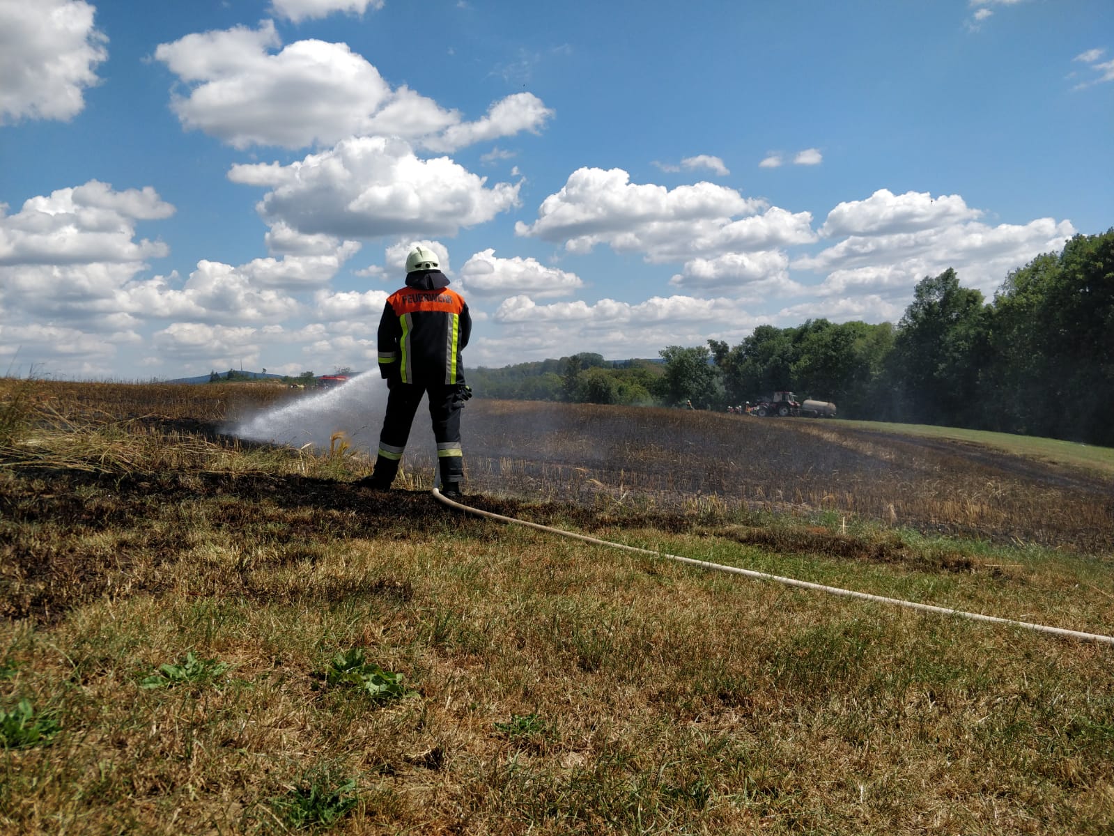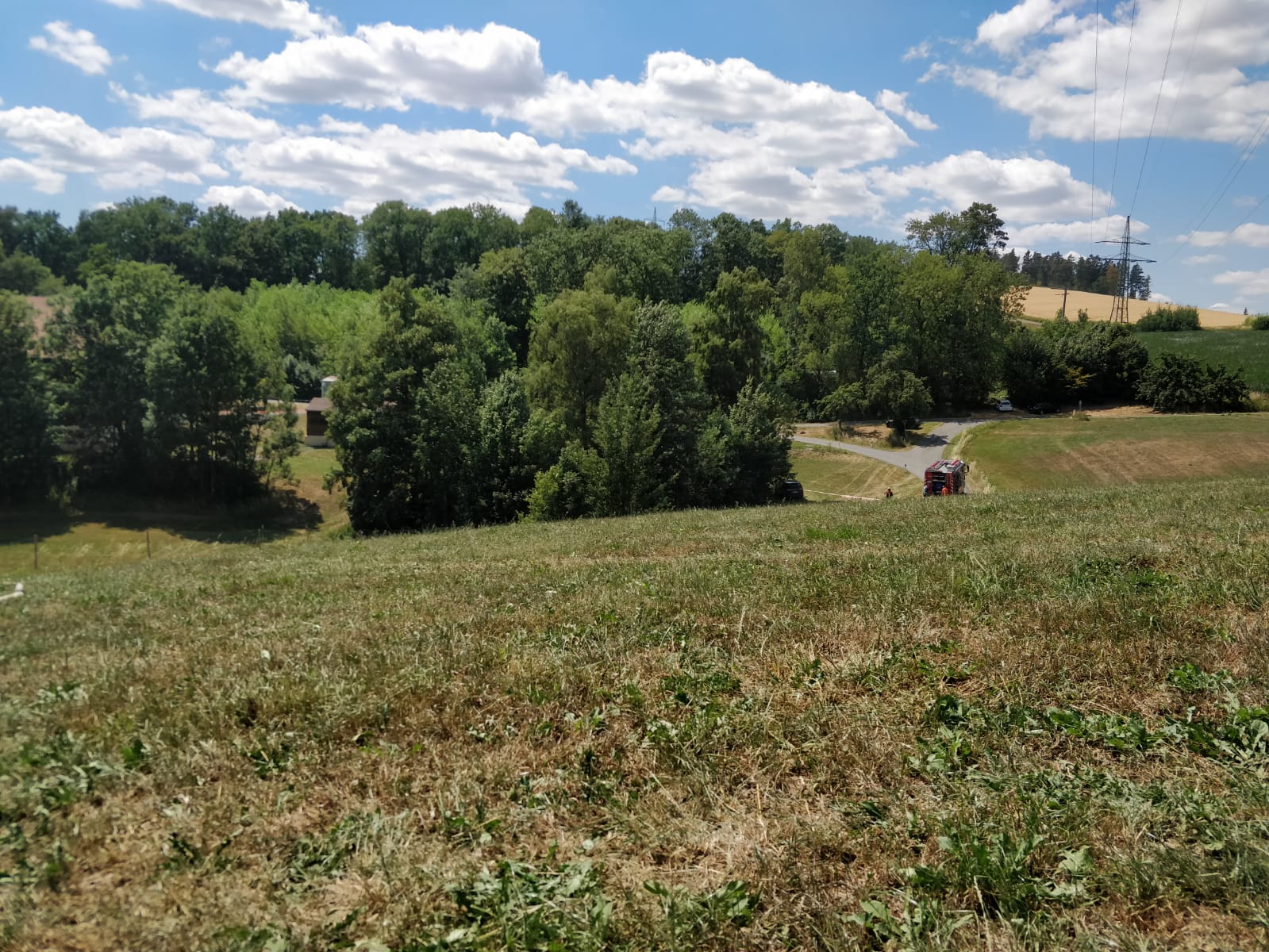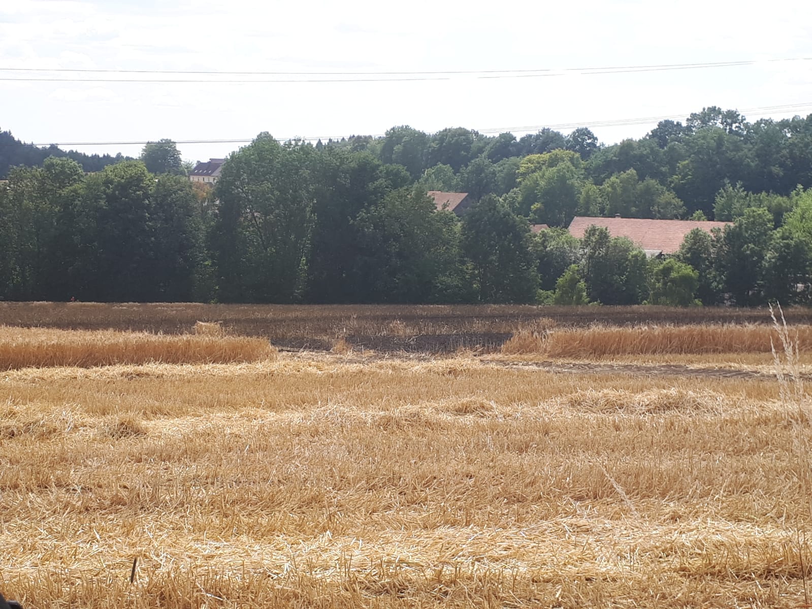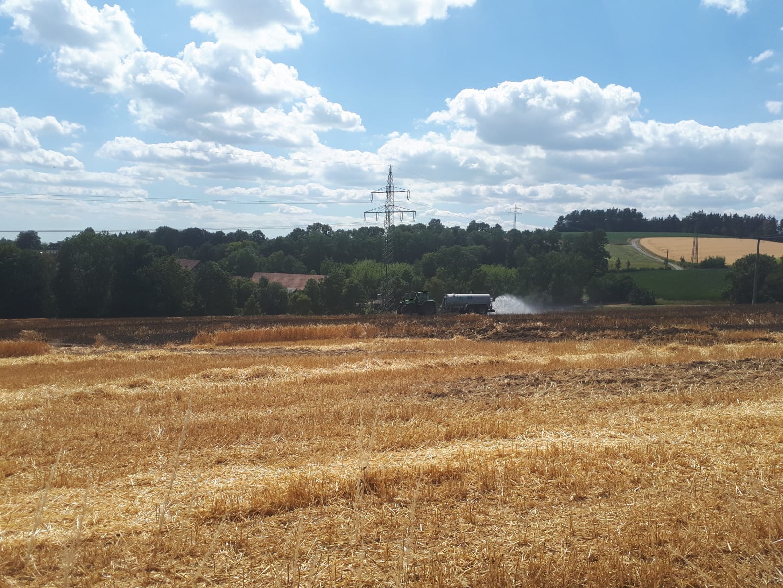 Heute geriet während Erntearbeiten ein Getreidefeld in Micheldorf in Brand. Wir wurden zusammen mit den Kameraden der Feuerwehr Rimlas gegen 13:35 zu einem kleineren Flächenbrand gerufen. Allerdings durchquerten wir bereits auf der Anfahrt eine dichte Rauchwolke und mussten kurze Zeit später feststellen, dass bereits das gesamte ca. 2ha große Feld brannte. Sofort ließen wir alle umliegenden wasserführenden Feuerwehren nachalarmieren, die kurze Zeit später eintrafen und uns bei den Löscharbeiten unterstützten. Es war Eile geboten, da der Wind das Feuer in die Richtung eines nahegelegenen Waldes trieb. Die Wiese wurde um das Feld herum mit mehreren mit Wasser befüllten Güllefässern angefeuchtet, um eine Brandausbreitung zu verhindern. Wir löschten auf und um dem Feld alle übrigen Brandherde ab, sodass bereits eine halbe Stunde später alle Flammen gelöscht waren. Abschließend befeuchteten wir den abgebrannten Boden, um ein erneutes Aufflammen zu verhindern.