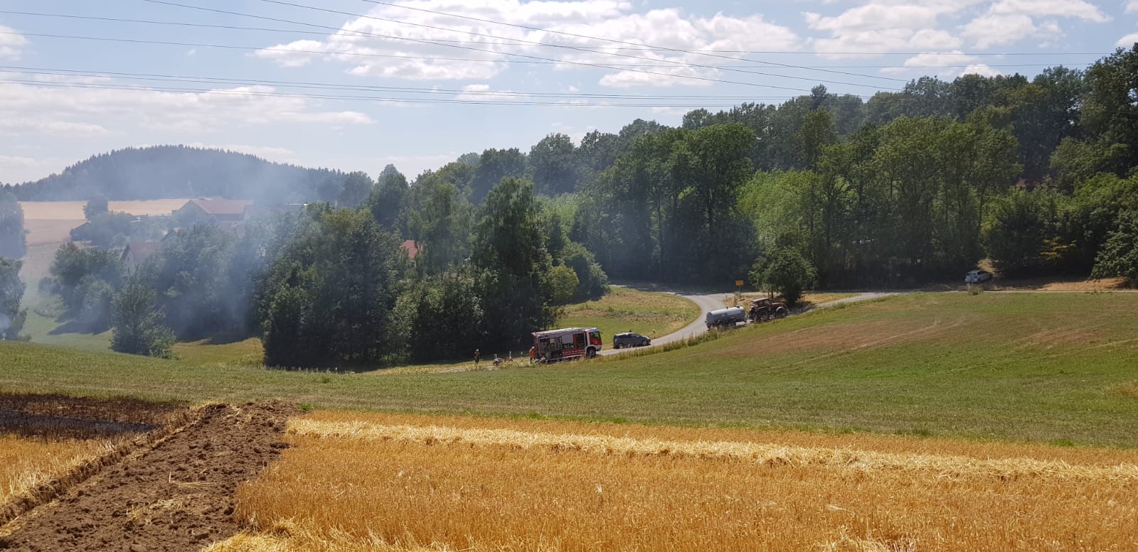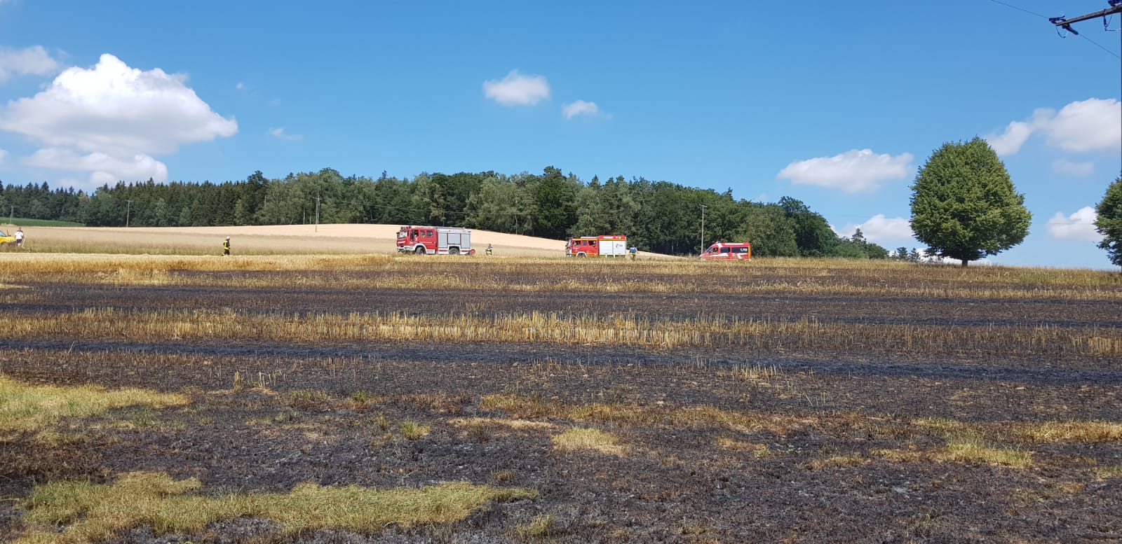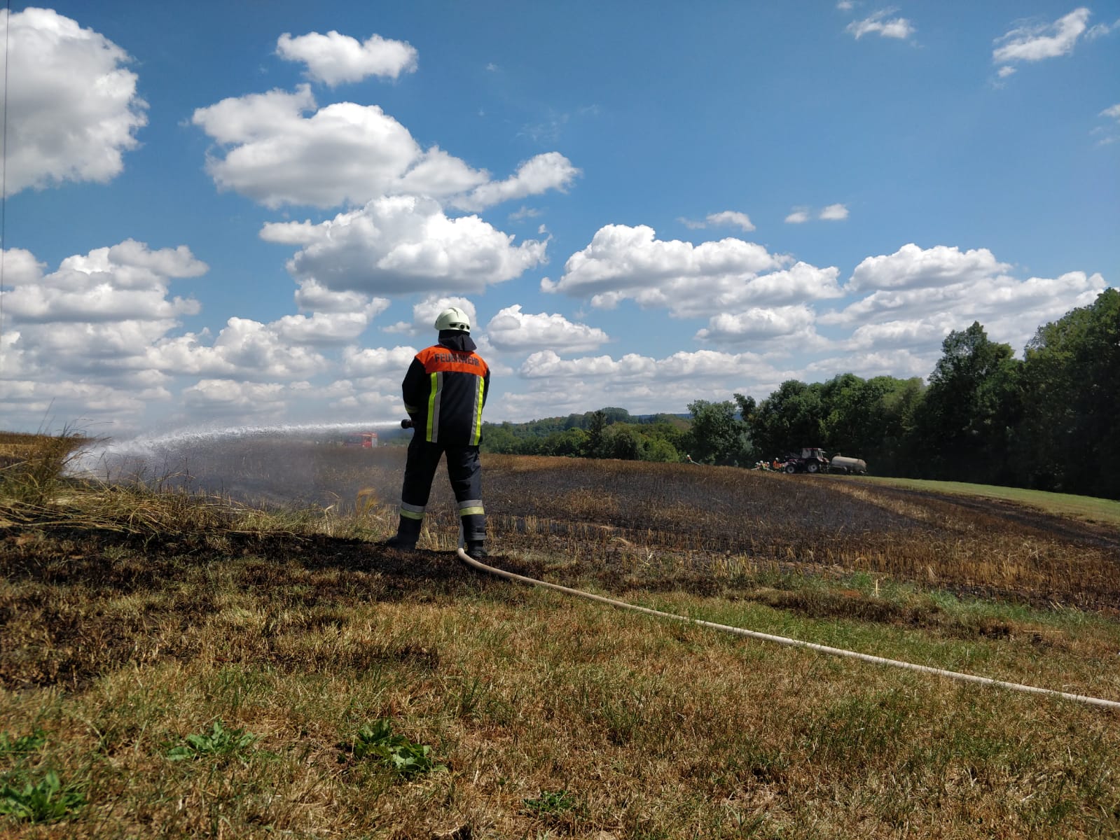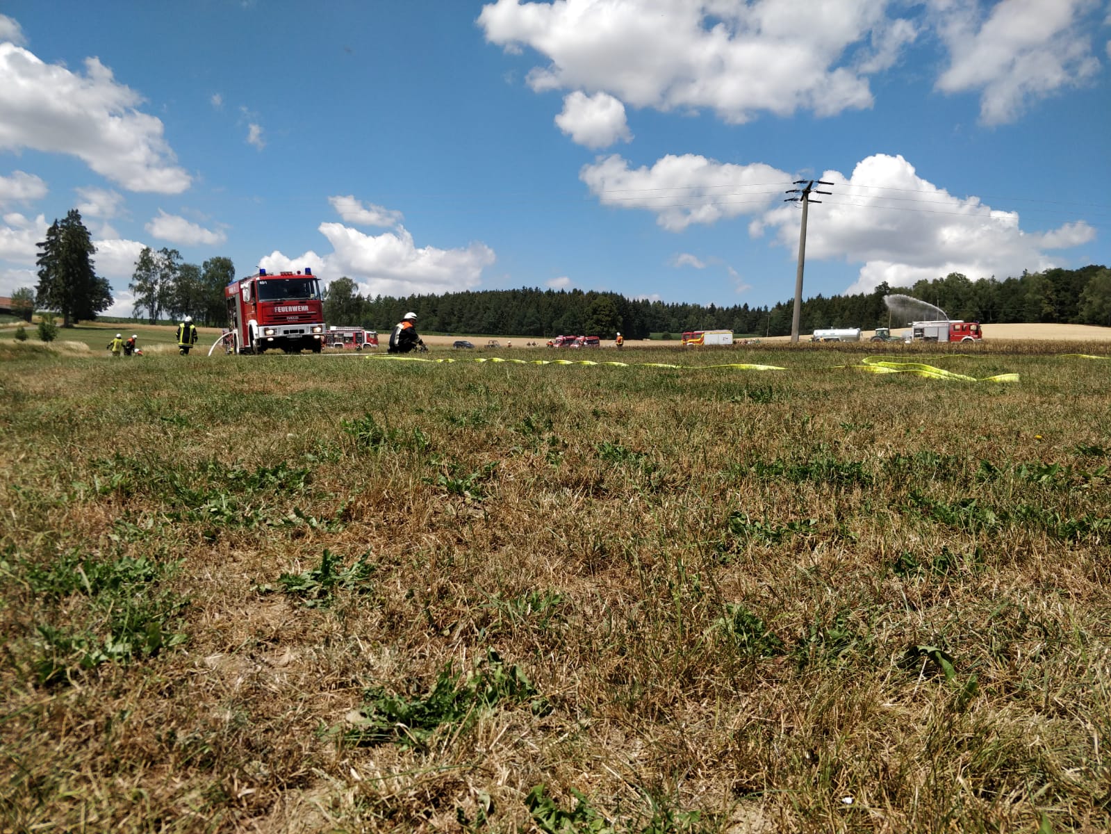 Heute geriet während Erntearbeiten ein Getreidefeld in Micheldorf in Brand. Wir wurden zusammen mit den Kameraden der Feuerwehr Rimlas gegen 13:35 zu einem kleineren Flächenbrand gerufen. Allerdings durchquerten wir bereits auf der Anfahrt eine dichte Rauchwolke und mussten kurze Zeit später feststellen, dass bereits das gesamte ca. 2ha große Feld brannte. Sofort ließen wir alle umliegenden wasserführenden Feuerwehren nachalarmieren, die kurze Zeit später eintrafen und uns bei den Löscharbeiten unterstützten. Es war Eile geboten, da der Wind das Feuer in die Richtung eines nahegelegenen Waldes trieb. Die Wiese wurde um das Feld herum mit mehreren mit Wasser befüllten Güllefässern angefeuchtet, um eine Brandausbreitung zu verhindern. Wir löschten auf und um dem Feld alle übrigen Brandherde ab, sodass bereits eine halbe Stunde später alle Flammen gelöscht waren. Abschließend befeuchteten wir den abgebrannten Boden, um ein erneutes Aufflammen zu verhindern.