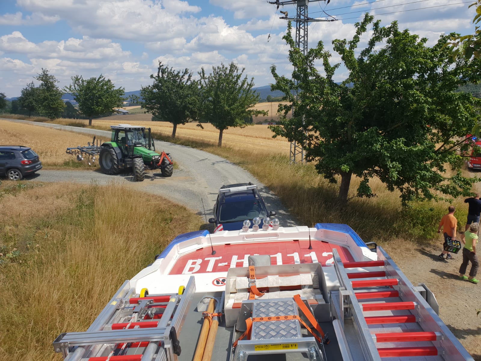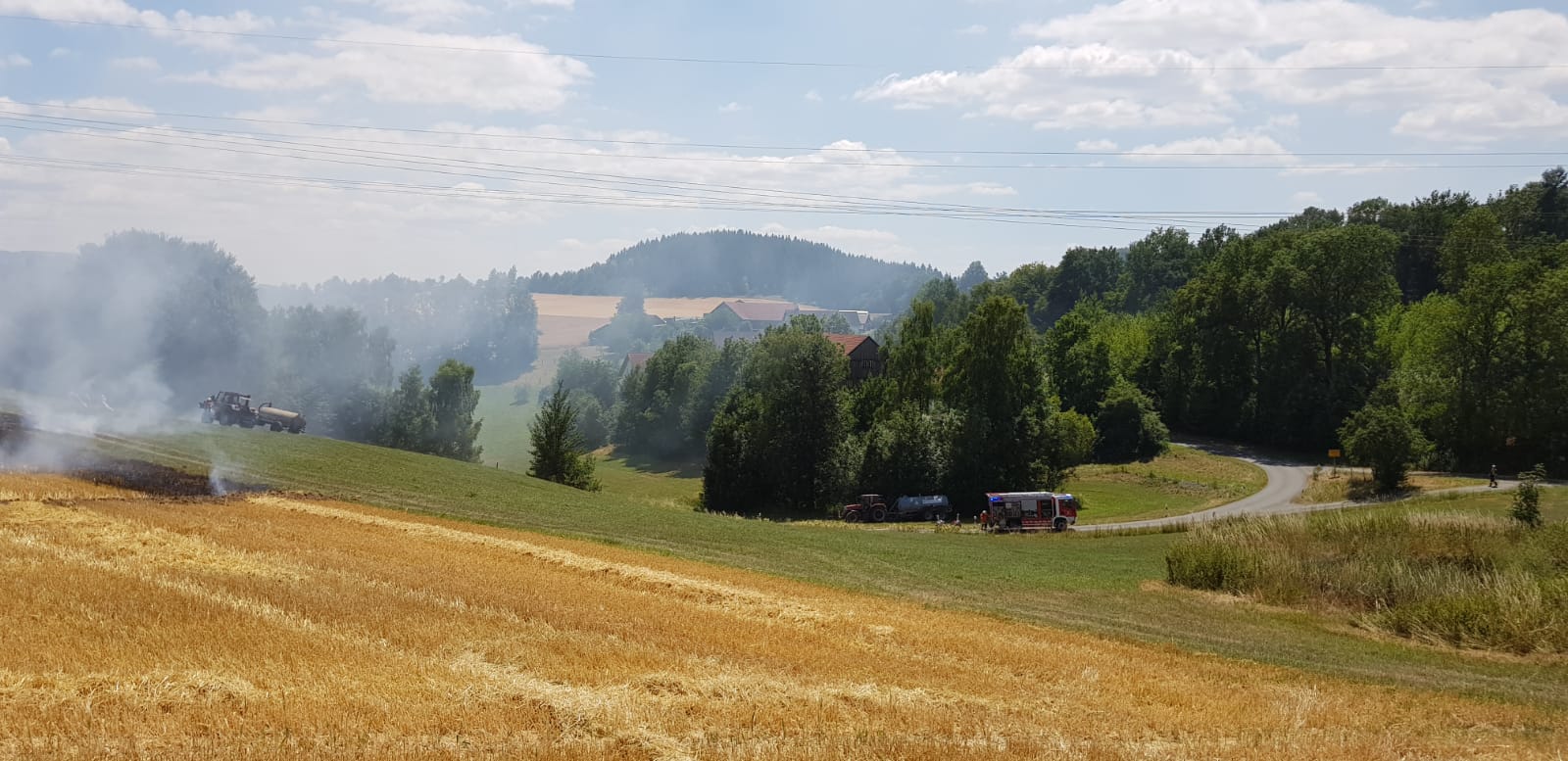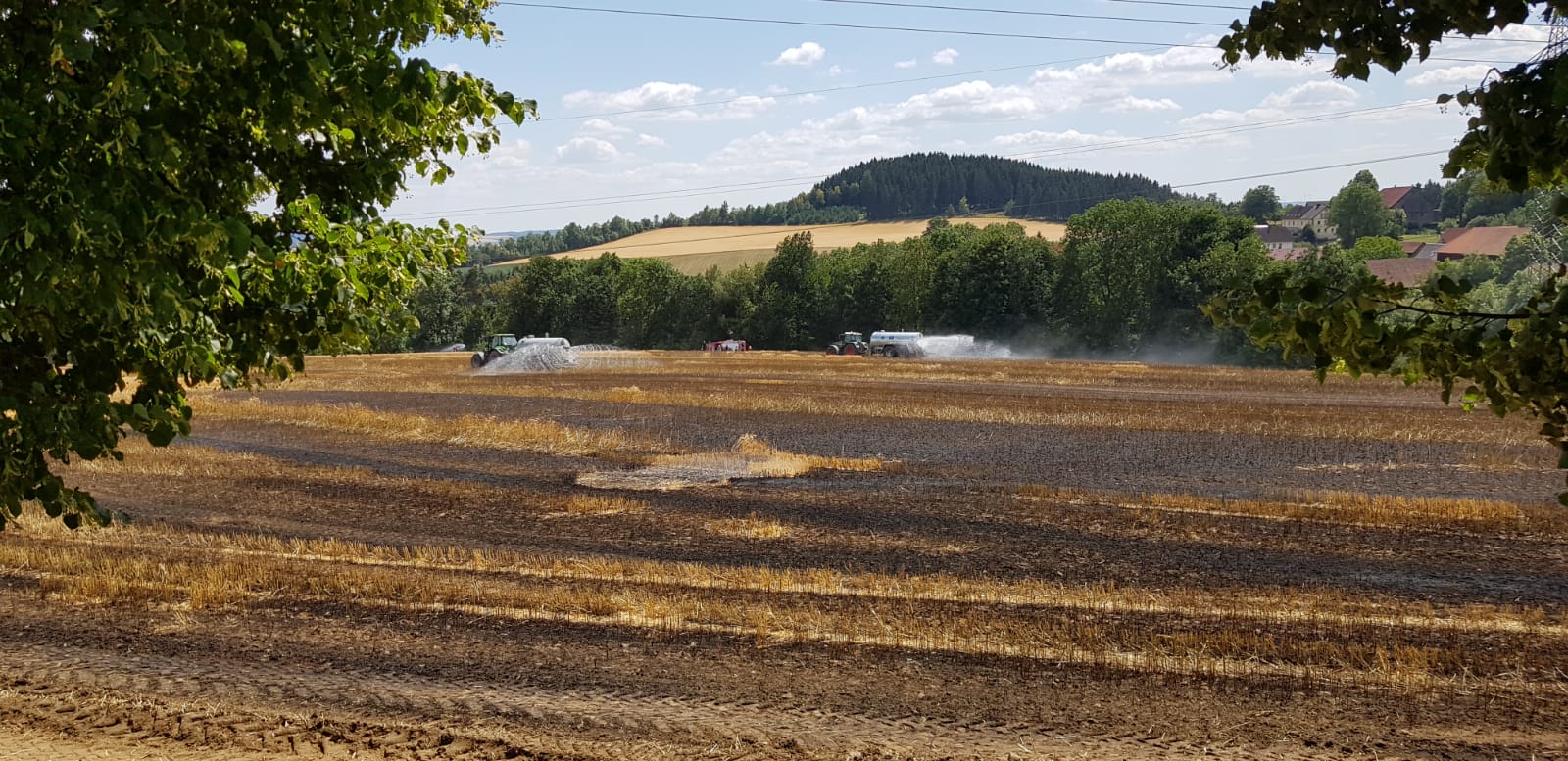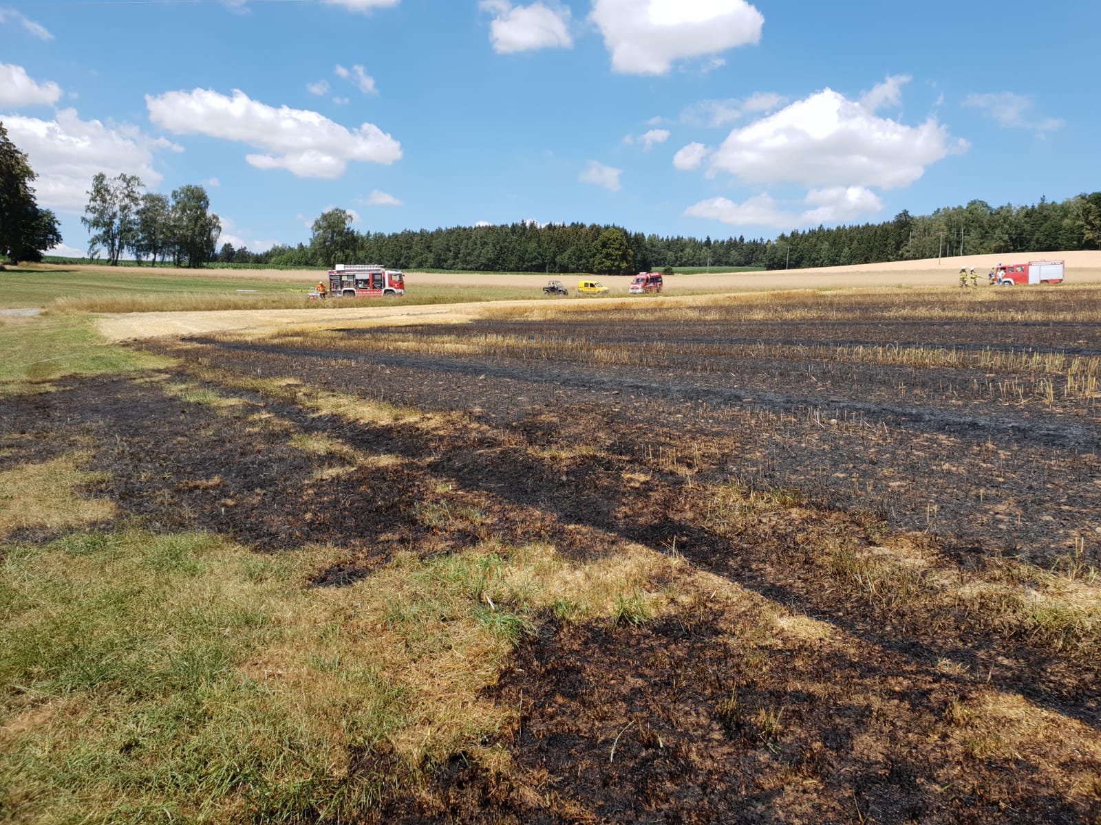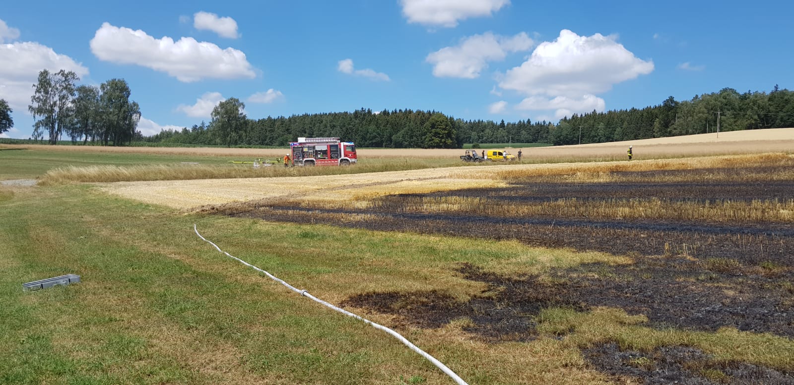 Heute geriet während Erntearbeiten ein Getreidefeld in Micheldorf in Brand. Wir wurden zusammen mit den Kameraden der Feuerwehr Rimlas gegen 13:35 zu einem kleineren Flächenbrand gerufen. Allerdings durchquerten wir bereits auf der Anfahrt eine dichte Rauchwolke und mussten kurze Zeit später feststellen, dass bereits das gesamte ca. 2ha große Feld brannte. Sofort ließen wir alle umliegenden wasserführenden Feuerwehren nachalarmieren, die kurze Zeit später eintrafen und uns bei den Löscharbeiten unterstützten. Es war Eile geboten, da der Wind das Feuer in die Richtung eines nahegelegenen Waldes trieb. Die Wiese wurde um das Feld herum mit mehreren mit Wasser befüllten Güllefässern angefeuchtet, um eine Brandausbreitung zu verhindern. Wir löschten auf und um dem Feld alle übrigen Brandherde ab, sodass bereits eine halbe Stunde später alle Flammen gelöscht waren. Abschließend befeuchteten wir den abgebrannten Boden, um ein erneutes Aufflammen zu verhindern.