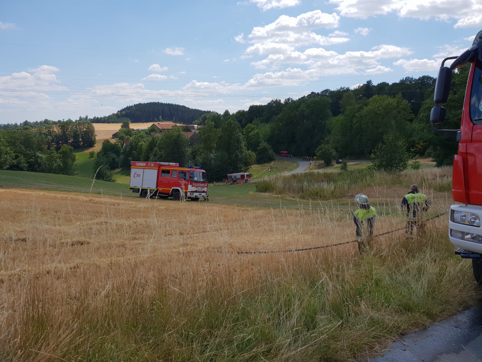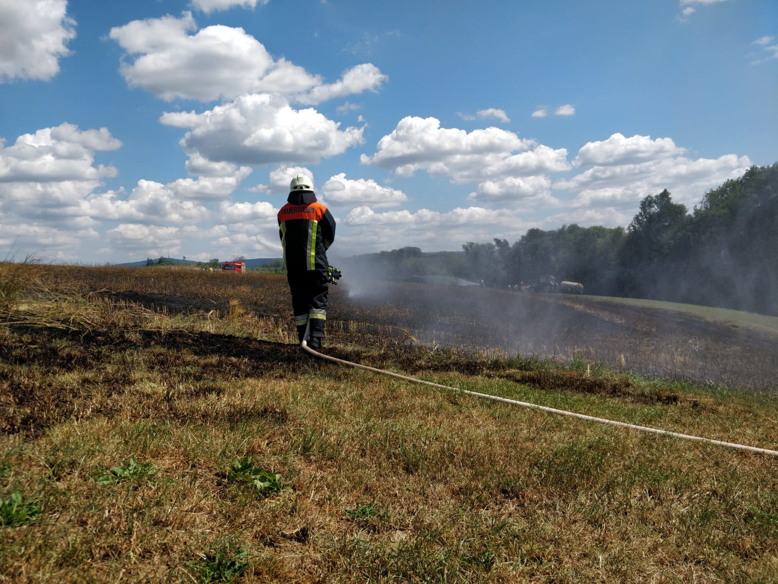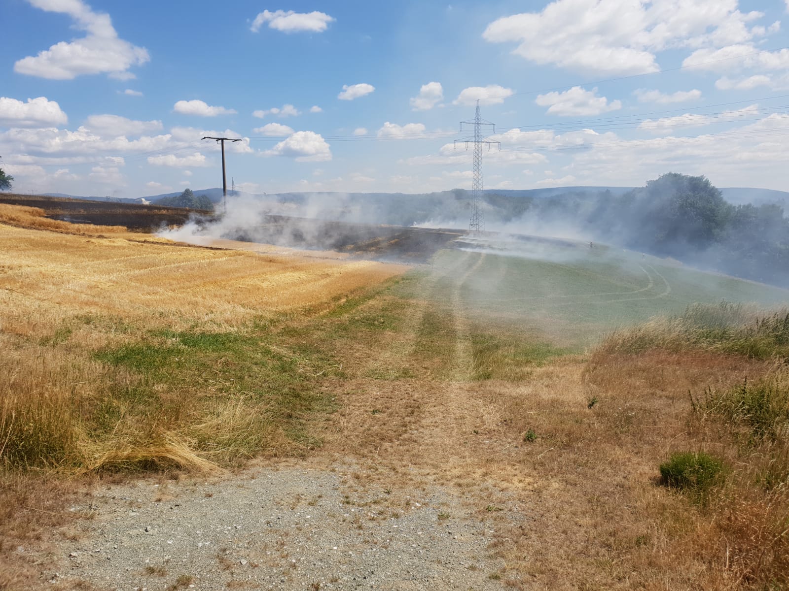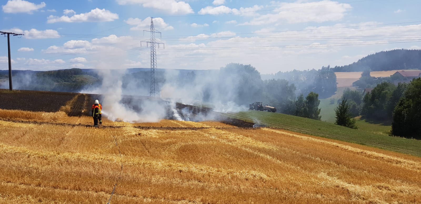 Heute geriet während Erntearbeiten ein Getreidefeld in Micheldorf in Brand. Wir wurden zusammen mit den Kameraden der Feuerwehr Rimlas gegen 13:35 zu einem kleineren Flächenbrand gerufen. Allerdings durchquerten wir bereits auf der Anfahrt eine dichte Rauchwolke und mussten kurze Zeit später feststellen, dass bereits das gesamte ca. 2ha große Feld brannte. Sofort ließen wir alle umliegenden wasserführenden Feuerwehren nachalarmieren, die kurze Zeit später eintrafen und uns bei den Löscharbeiten unterstützten. Es war Eile geboten, da der Wind das Feuer in die Richtung eines nahegelegenen Waldes trieb. Die Wiese wurde um das Feld herum mit mehreren mit Wasser befüllten Güllefässern angefeuchtet, um eine Brandausbreitung zu verhindern. Wir löschten auf und um dem Feld alle übrigen Brandherde ab, sodass bereits eine halbe Stunde später alle Flammen gelöscht waren. Abschließend befeuchteten wir den abgebrannten Boden, um ein erneutes Aufflammen zu verhindern.