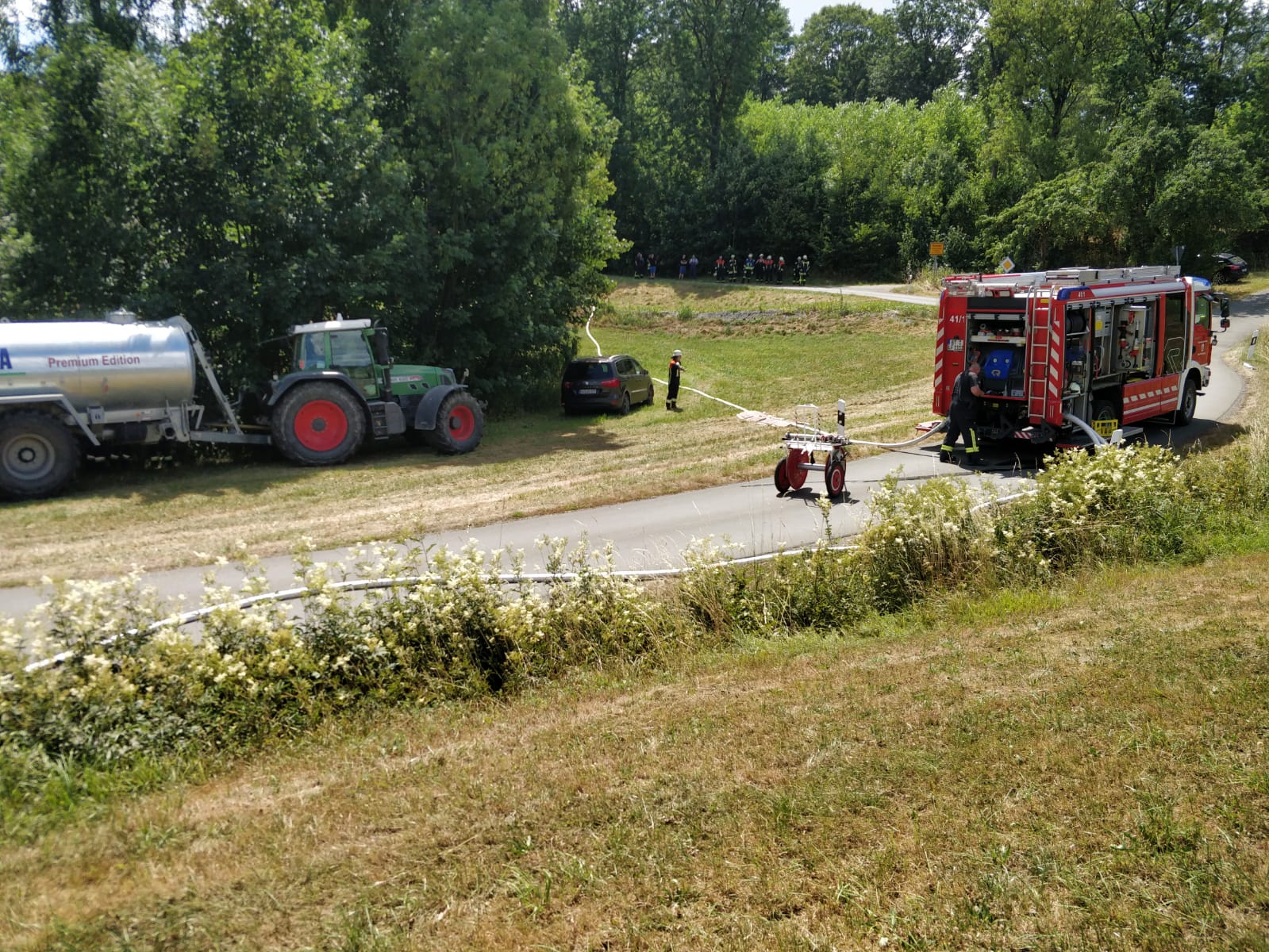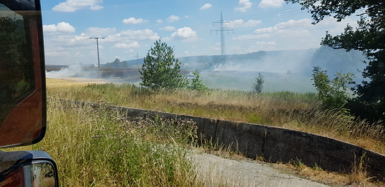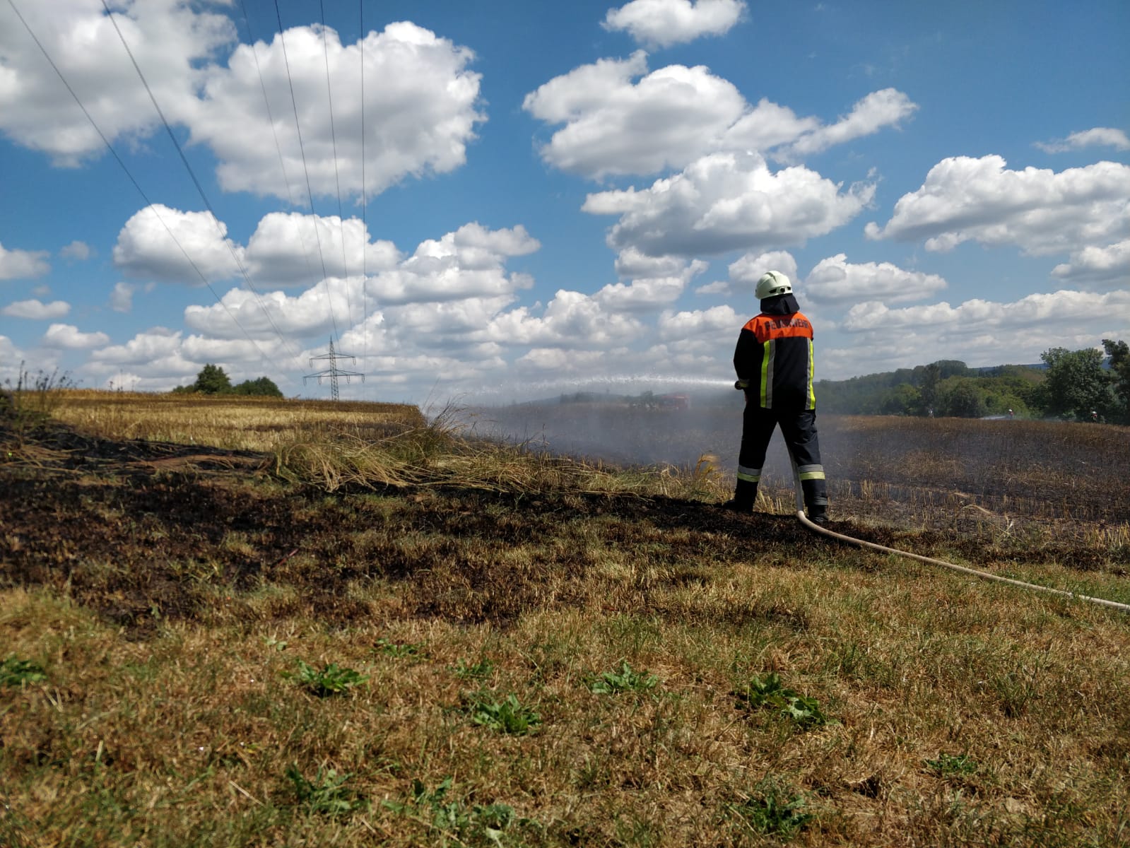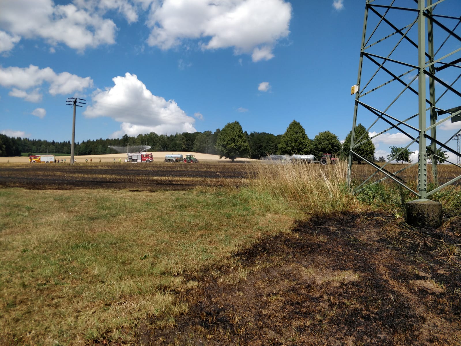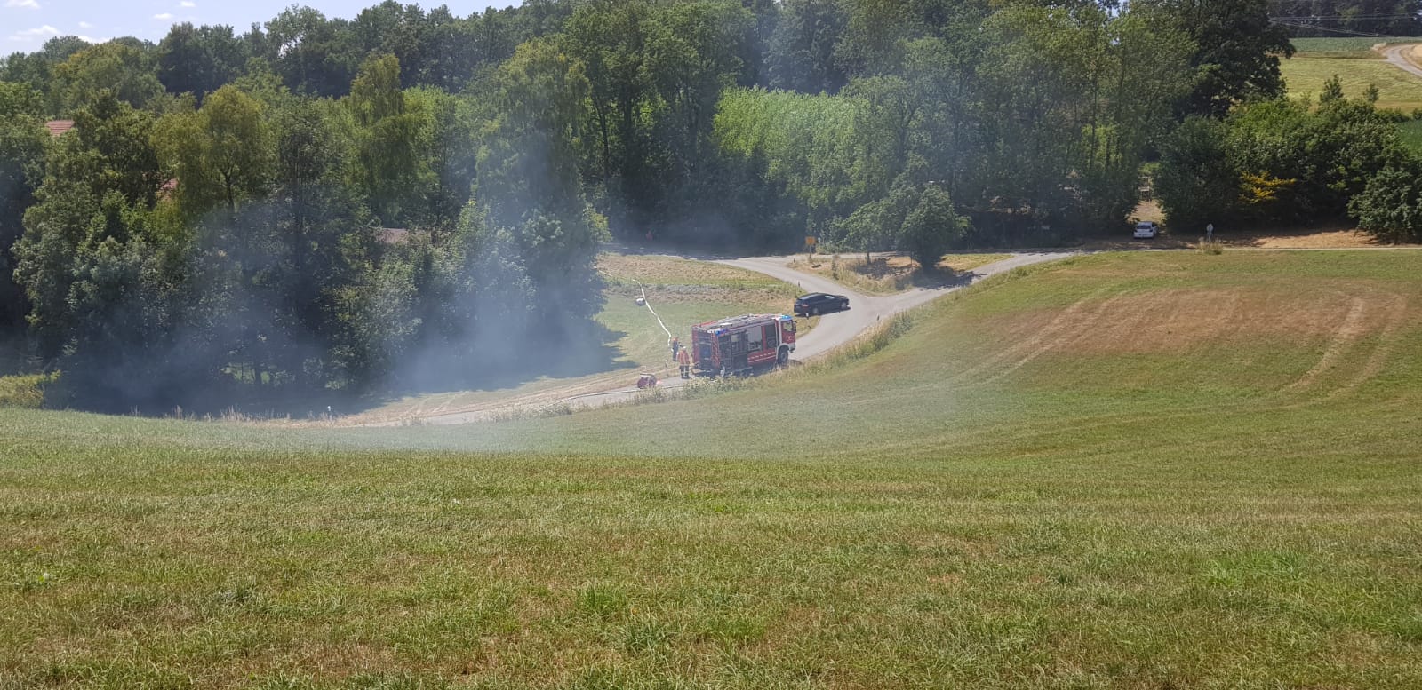 Heute geriet während Erntearbeiten ein Getreidefeld in Micheldorf in Brand. Wir wurden zusammen mit den Kameraden der Feuerwehr Rimlas gegen 13:35 zu einem kleineren Flächenbrand gerufen. Allerdings durchquerten wir bereits auf der Anfahrt eine dichte Rauchwolke und mussten kurze Zeit später feststellen, dass bereits das gesamte ca. 2ha große Feld brannte. Sofort ließen wir alle umliegenden wasserführenden Feuerwehren nachalarmieren, die kurze Zeit später eintrafen und uns bei den Löscharbeiten unterstützten. Es war Eile geboten, da der Wind das Feuer in die Richtung eines nahegelegenen Waldes trieb. Die Wiese wurde um das Feld herum mit mehreren mit Wasser befüllten Güllefässern angefeuchtet, um eine Brandausbreitung zu verhindern. Wir löschten auf und um dem Feld alle übrigen Brandherde ab, sodass bereits eine halbe Stunde später alle Flammen gelöscht waren. Abschließend befeuchteten wir den abgebrannten Boden, um ein erneutes Aufflammen zu verhindern.