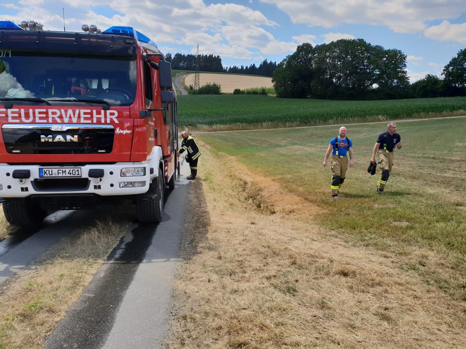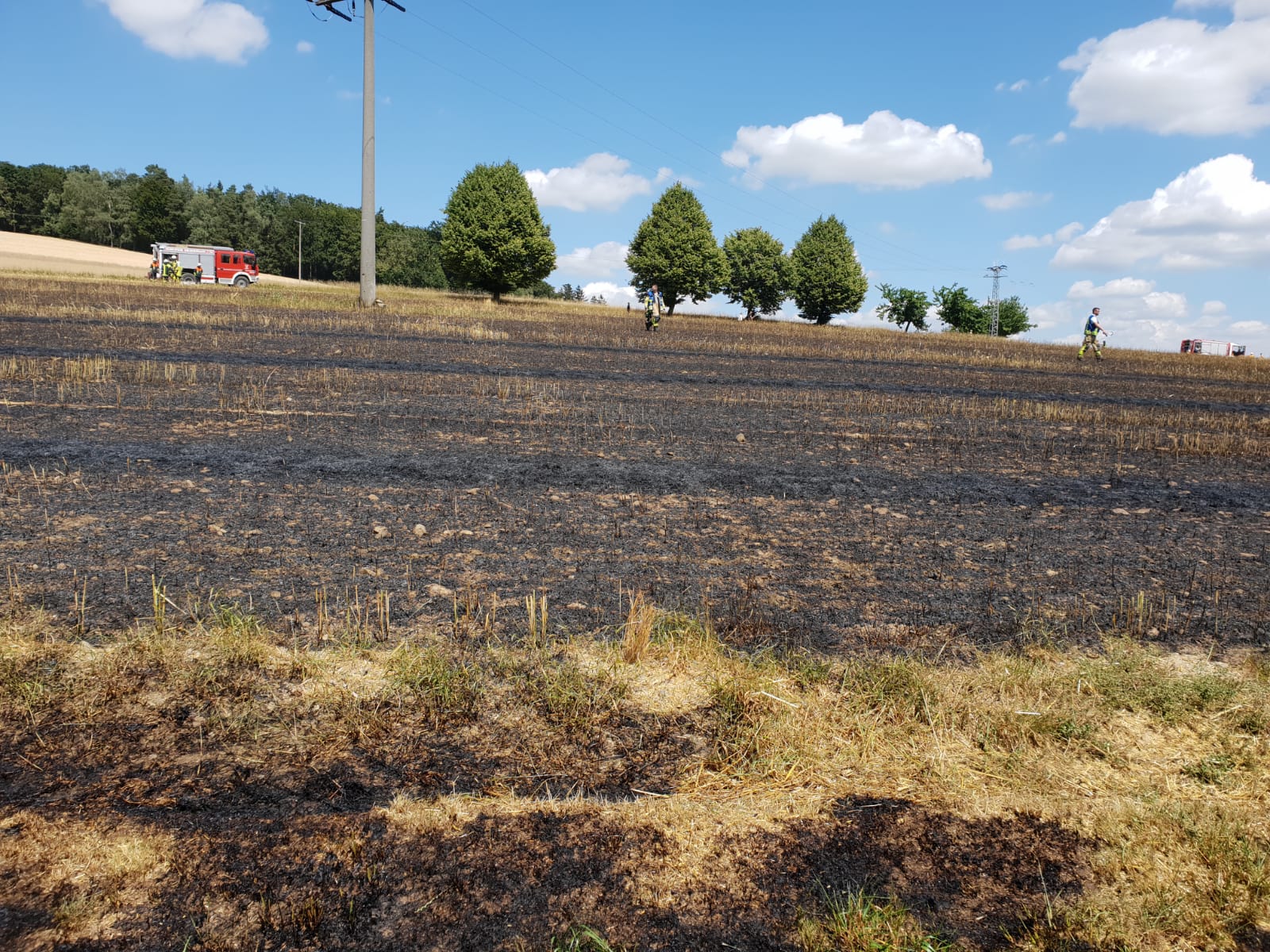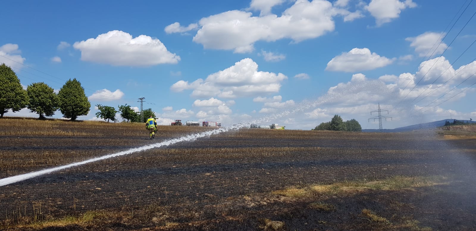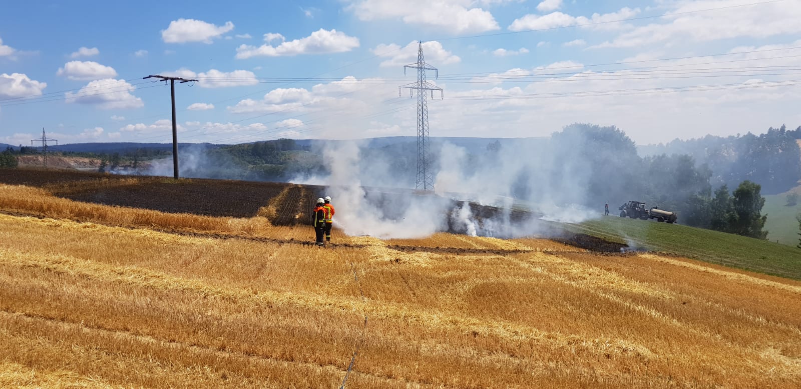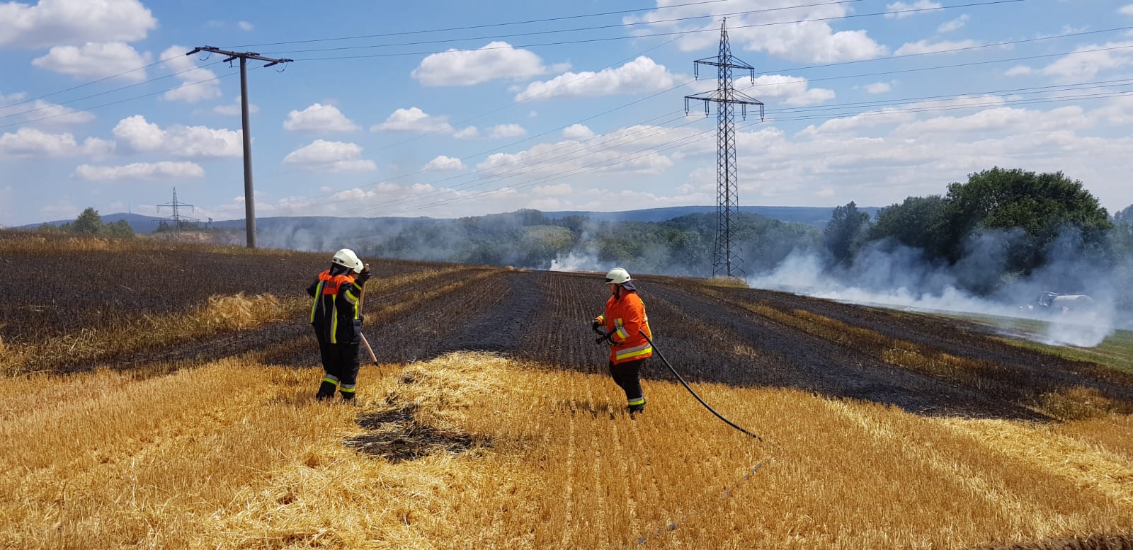 Heute geriet während Erntearbeiten ein Getreidefeld in Micheldorf in Brand. Wir wurden zusammen mit den Kameraden der Feuerwehr Rimlas gegen 13:35 zu einem kleineren Flächenbrand gerufen. Allerdings durchquerten wir bereits auf der Anfahrt eine dichte Rauchwolke und mussten kurze Zeit später feststellen, dass bereits das gesamte ca. 2ha große Feld brannte. Sofort ließen wir alle umliegenden wasserführenden Feuerwehren nachalarmieren, die kurze Zeit später eintrafen und uns bei den Löscharbeiten unterstützten. Es war Eile geboten, da der Wind das Feuer in die Richtung eines nahegelegenen Waldes trieb. Die Wiese wurde um das Feld herum mit mehreren mit Wasser befüllten Güllefässern angefeuchtet, um eine Brandausbreitung zu verhindern. Wir löschten auf und um dem Feld alle übrigen Brandherde ab, sodass bereits eine halbe Stunde später alle Flammen gelöscht waren. Abschließend befeuchteten wir den abgebrannten Boden, um ein erneutes Aufflammen zu verhindern.