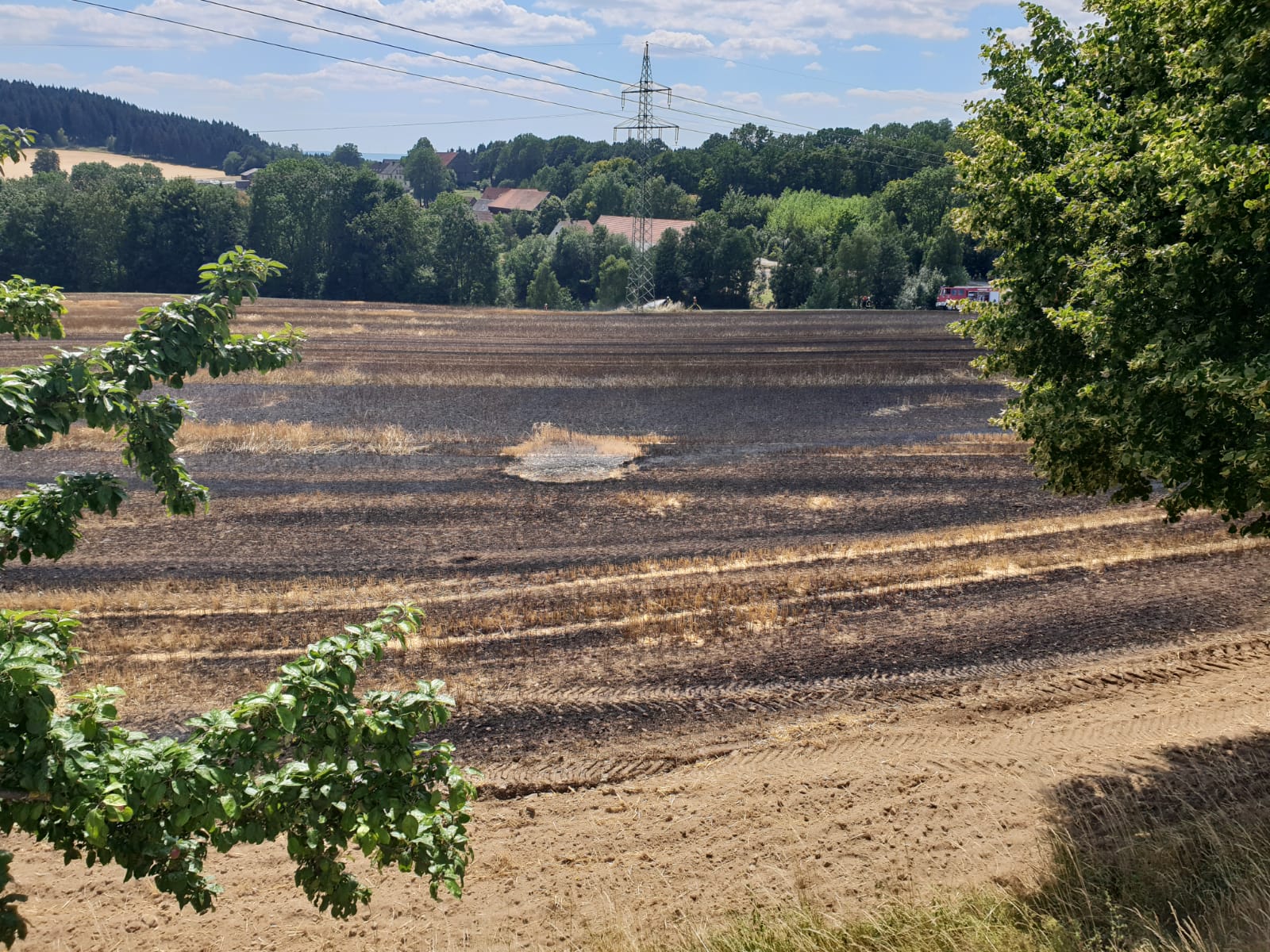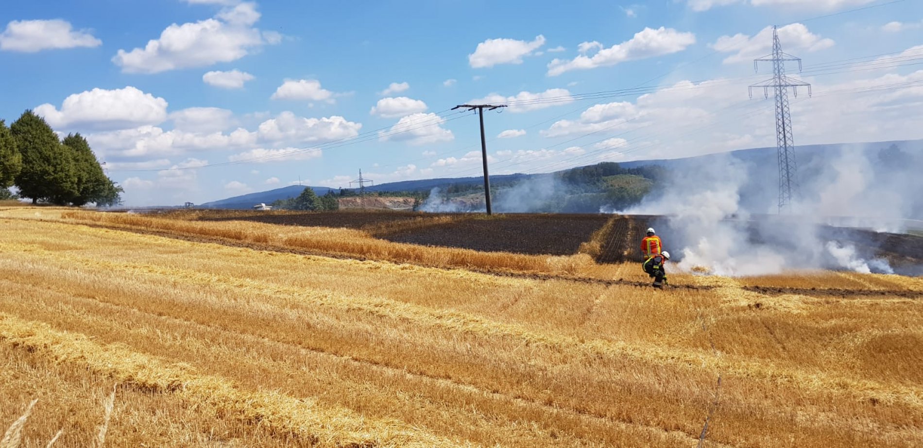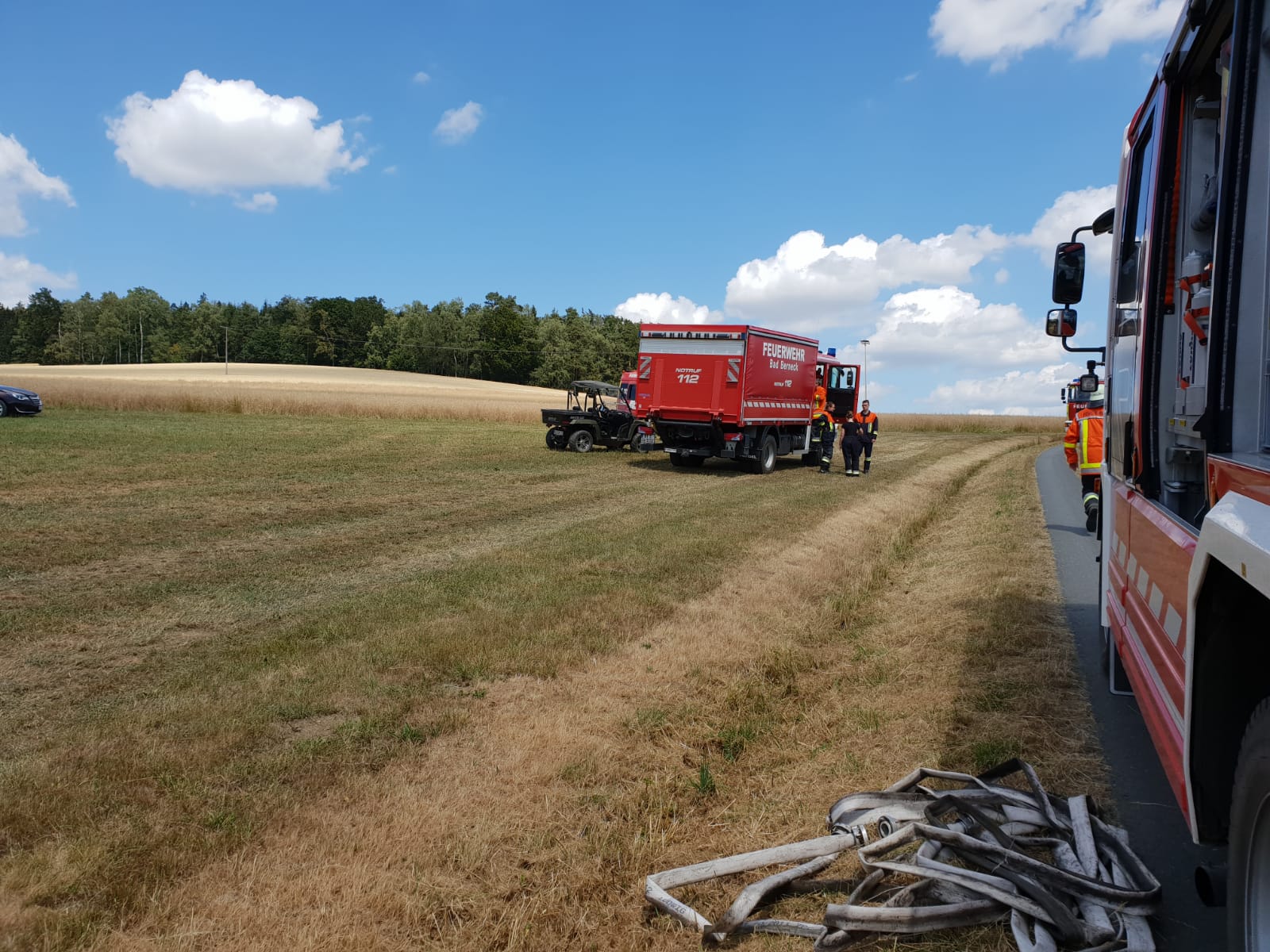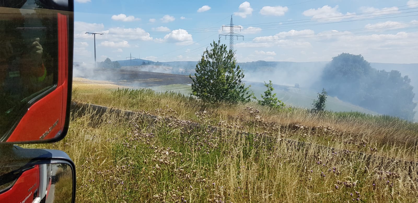 Heute geriet während Erntearbeiten ein Getreidefeld in Micheldorf in Brand. Wir wurden zusammen mit den Kameraden der Feuerwehr Rimlas gegen 13:35 zu einem kleineren Flächenbrand gerufen. Allerdings durchquerten wir bereits auf der Anfahrt eine dichte Rauchwolke und mussten kurze Zeit später feststellen, dass bereits das gesamte ca. 2ha große Feld brannte. Sofort ließen wir alle umliegenden wasserführenden Feuerwehren nachalarmieren, die kurze Zeit später eintrafen und uns bei den Löscharbeiten unterstützten. Es war Eile geboten, da der Wind das Feuer in die Richtung eines nahegelegenen Waldes trieb. Die Wiese wurde um das Feld herum mit mehreren mit Wasser befüllten Güllefässern angefeuchtet, um eine Brandausbreitung zu verhindern. Wir löschten auf und um dem Feld alle übrigen Brandherde ab, sodass bereits eine halbe Stunde später alle Flammen gelöscht waren. Abschließend befeuchteten wir den abgebrannten Boden, um ein erneutes Aufflammen zu verhindern.