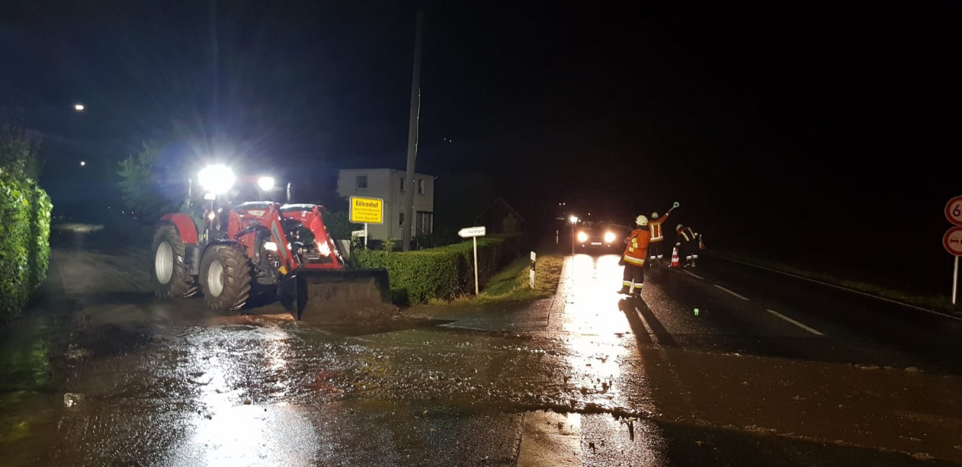 Bis nach 22:00 waren wir mit vier Fahrzeugen und den Kameraden der Feuerwehren Goldmühl und Escherlich im Einsatz. Wir leerten verstopfte Gullis am Edeka, Galgenberg und beim Hotel Bube und reinigten die Straßen am Galgenberg, Rosengarten und an der ehem. B2 am Ortsausgang in Richtung Bayreuth von Schlamm und Geröll. In Röhrenhof war die Straße so sehr verschmutzt, dass der Schlamm mit einem Traktor weggeschoben werden musste. In Goldmühl kümmerten wir uns um einen unter Wasser stehenden Pferdestall. Desweiteren überprüften wir mehrere bekannte Problemstellen, wie z.B. einen Ablauf am Bärnreuther Weg und die Keller mehrerer Wohnhäuser, dort mussten wir jedoch nicht weiter tätig werden. Insgesammt arbeiteten wir an dem Abend neun Einsätze ab.